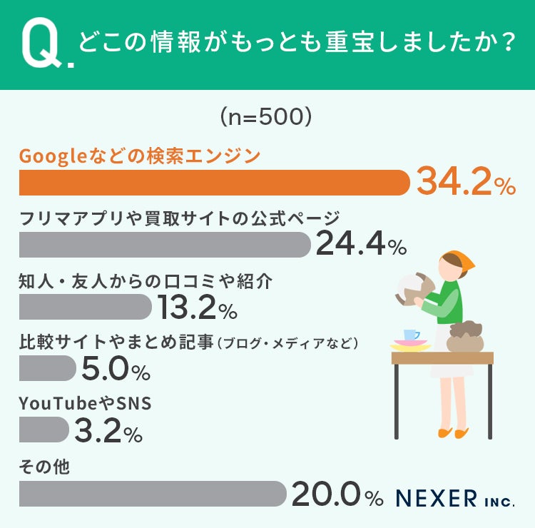 「Googleなどの検索エンジン」が34.2%、「フリマアプリや買取サイトの公式ページ」が24.4%という結果になりました。
