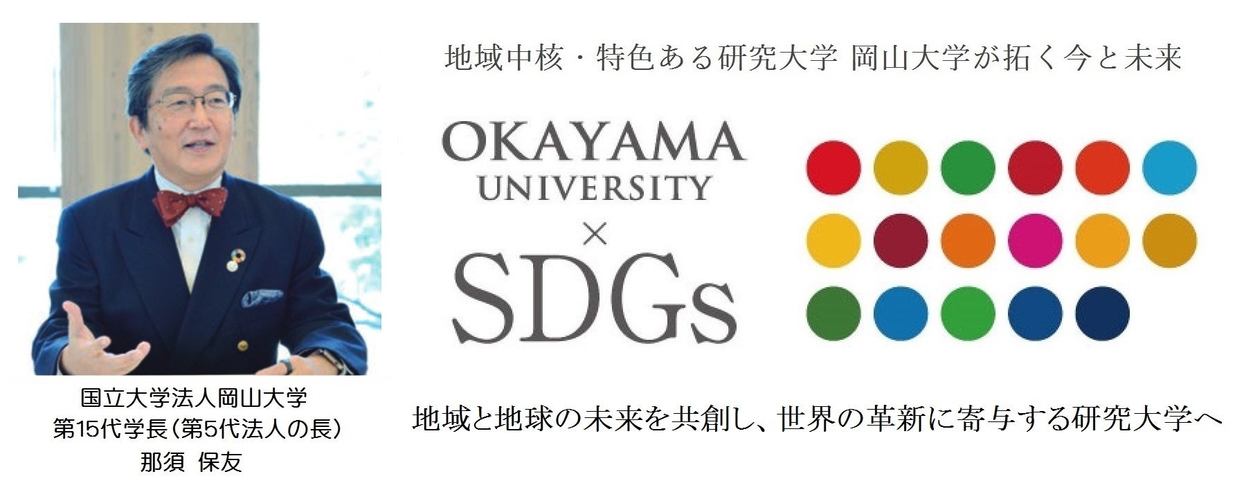 国立大学法人岡山大学は、国連の「持続可能な開発目標(SDGs)」を支援しています。また、政府の第1回「ジャパンSDGsアワード」特別賞を受賞しています。地域中核・特色ある研究大学である岡山大学にご期待ください
