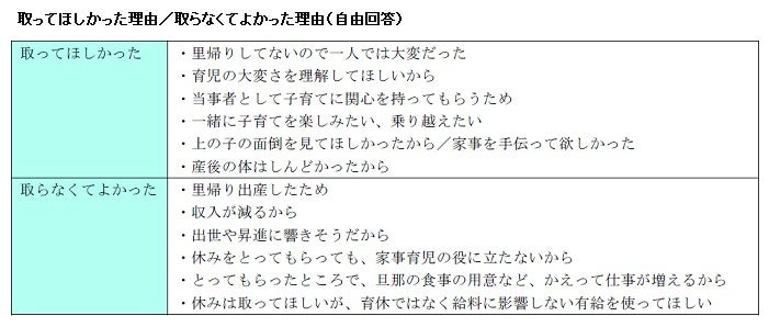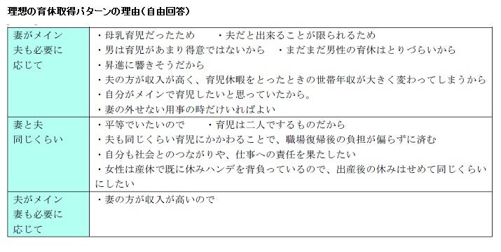・理想の育休取得パターンを聞くと、「妻が主に取得し夫も必要に応じて」が最も多く78.1%。理由としては、「夫のほうが収入が高い」「昇進にかかわるから」「夫一人では子供の面倒を見られない」などの意見が多かった。「夫と妻が同じくらい(19.3%)」と回答した人の理由は「自分も仕事の責任を果たしたい」「妻は妊娠期にも休んでいる。せめて生んだ後の休みは同じくらいにしたい」「職場復帰後の負担が偏らずに済む」などで、キャリアも子育ての分担も対等にしたいという意識が窺えた。【図9、10】