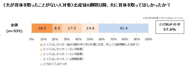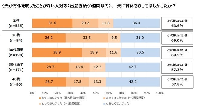 夫が育休を取ったことがない人のうち、出産直後(8週間以内)に、夫が育休を取れたとしたら取ってほしかったと回答したワーキングマザーは63.6%。年代別で見ると、20代は69.0%に対し40代は57.8%と、「夫婦での子育て」に対する意識は、年代によって差があることが明らかになった。出産後8週間以降についても、57.6%が育休を取ってほしかったと回答した。【図1、2、3】
