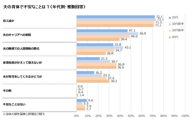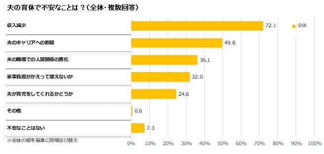 - 夫の育休取得で不安なことは、収入減少がトップで72.1%。次いで、夫のキャリアへの影響(49.8%)、夫の職場での人間関係悪化(36.1%)【図4】