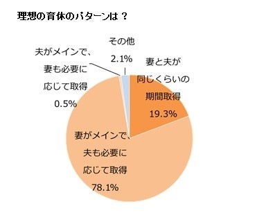 - 理想の育休取得パターンは「妻がメインで夫も必要に応じて」が78.1%と圧倒的多数。「妻と夫が同じくらい」は19.3%。【図9】
