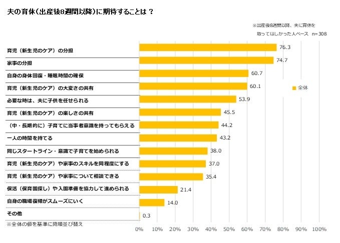 ・夫の育休(出産後8週間以内)に期待することは、「育児分担(82.9%)」「家事分担(75.3%)」「自身の身体の回復・睡眠時間の確保(66.5%)」となった。出産後8週間以降では「保活(保育園探しや申込準備)・入園準備の協力(21.4%)」「自身の職場復帰がスムーズになること(14.0%)」という回答が増加。仕事復帰において、夫が協力することの必要性を感じていることがわかる。【図7、8】