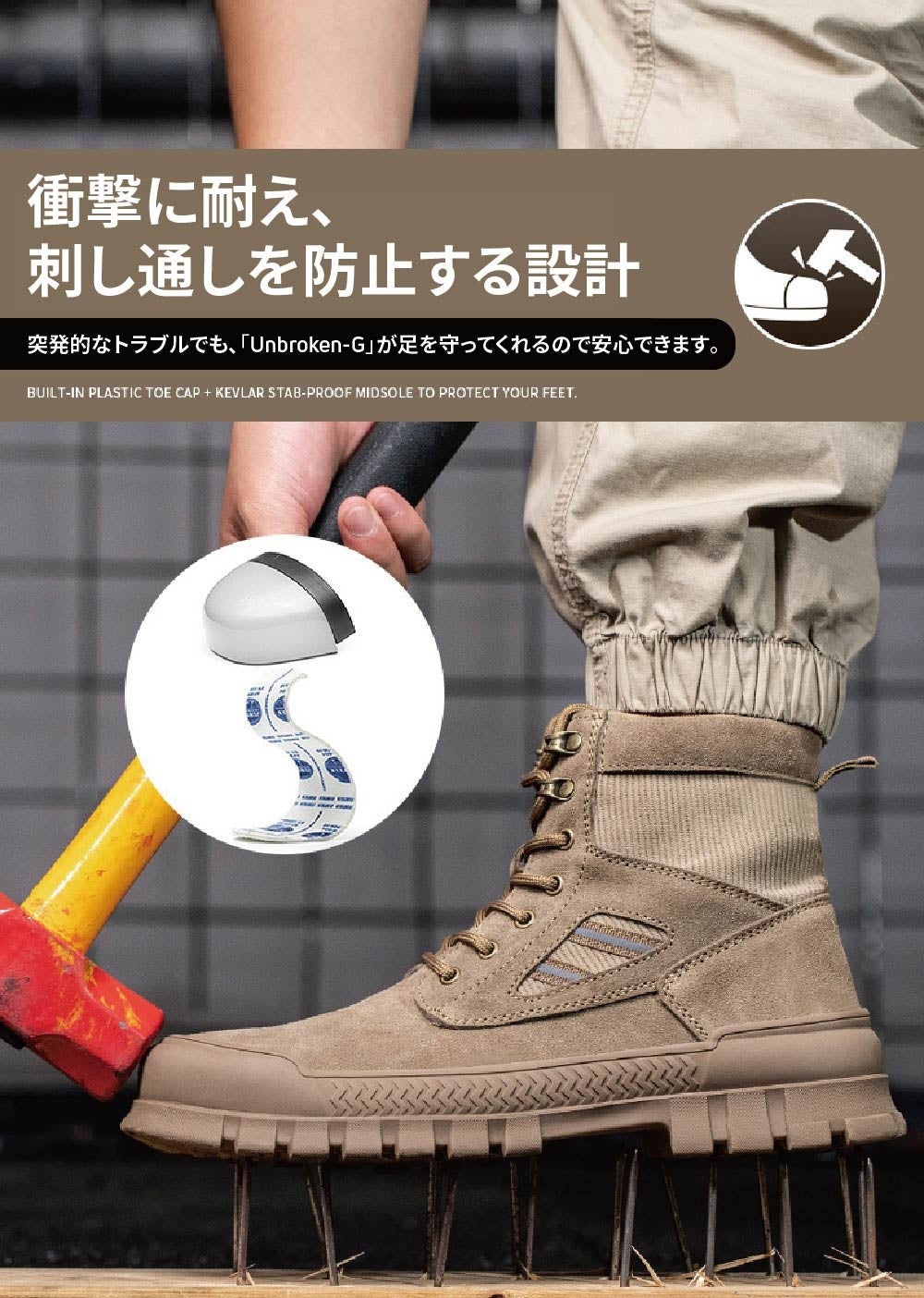 基本的に安全靴はクリティカルな現場での使用を想定したつくりになっていますが、UnBroke-H1(アンブローク・エッチワン)は軽量化されたボディや通気性の優れた内部設計、さらには普段使いしやすいカジュアルなデザインなど幅広いユーザーのこと想ってつくられています。