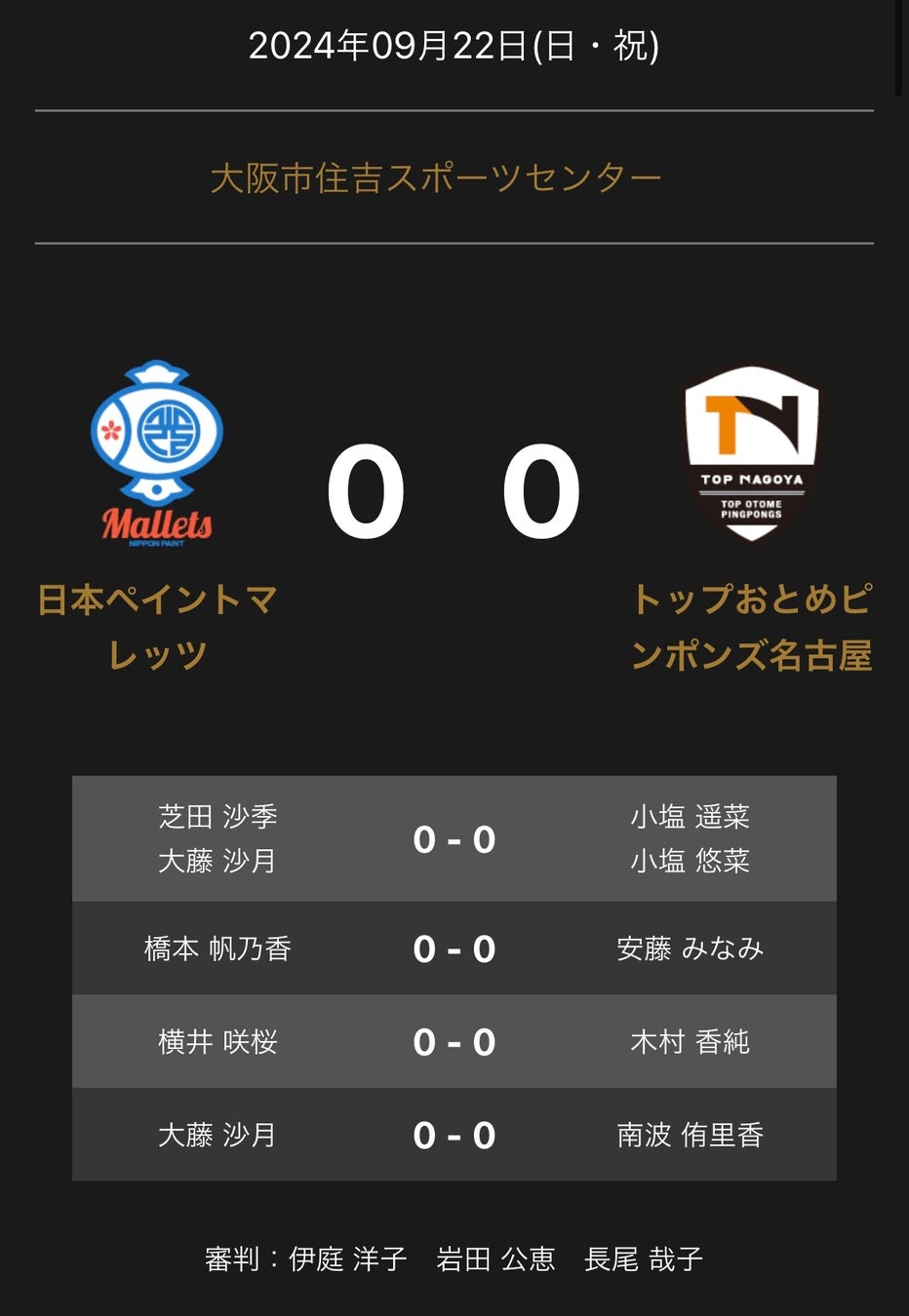 ノジマTリーグ 2024-2025シーズン 公式戦 9月22日開催 日本ペイントマレッツ vs トップおとめピンポンズ名古屋 対戦オーダー発表