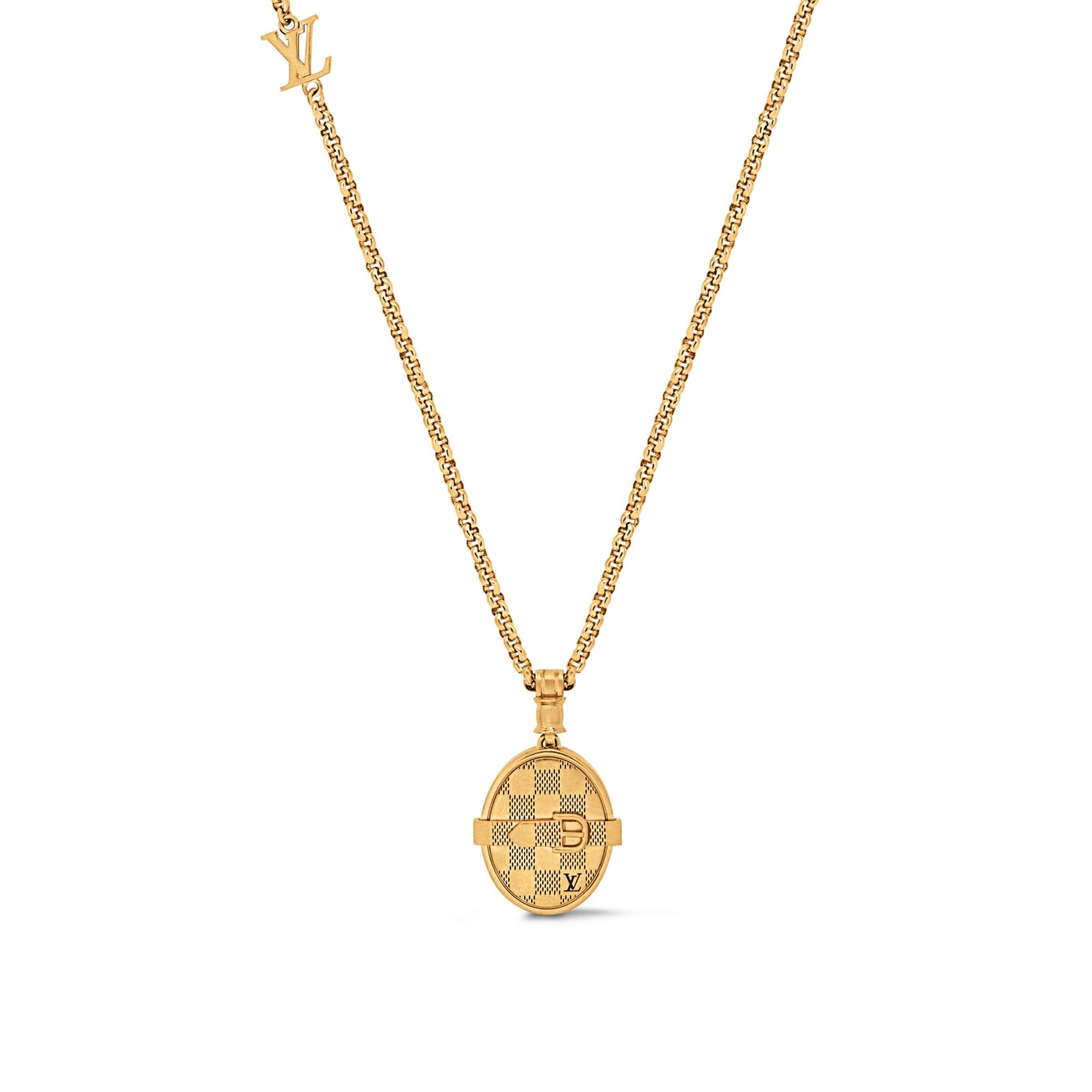 ゴールドカラーのメタルで仕上げた「ペンダント·LV ダミエ」。愛するペットにスポットライトを当てたチャーミングなネックレスです。一部にLV シグネチャーをあしらったダミエ·パターンの刻印の上にフェイクベルトのデザインをエンボス加工で施しました。クラムシェルのように開くロケットの内側には写真を収納できます。