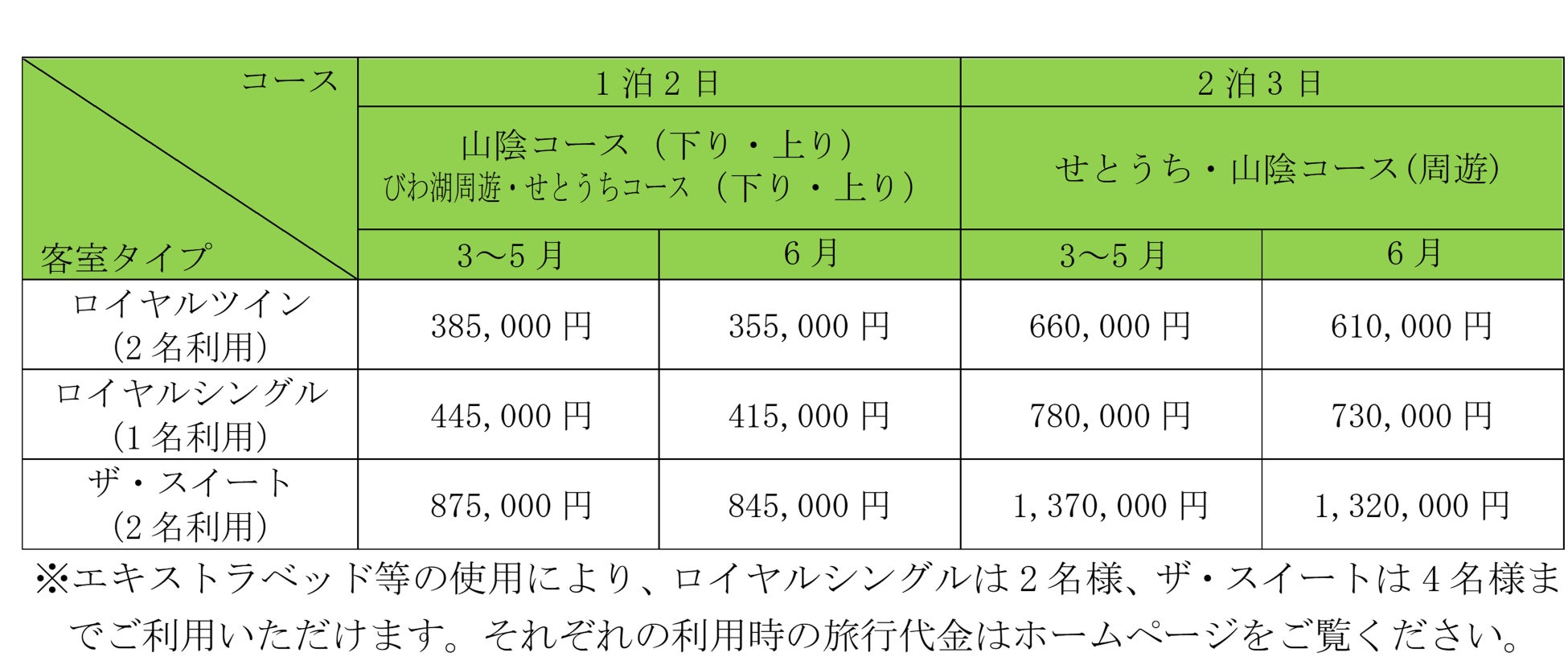 ・ 「TWILIGHT EXPRESS 瑞風」の旅は、全て旅行商品として販売し、専用窓口「TWILIGHT EXPRESS 瑞風 ツアーデスク」で販売するほか、主な旅行会社での販売を予定しております。