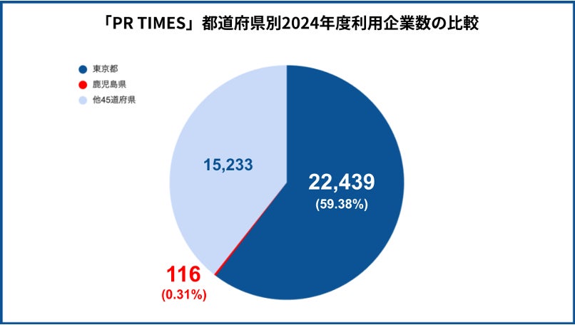 しかし、その価値を伝える手段の一つであるプレスリリースの活用は、いまだ東京一極集中の傾向があります。例えば、プレスリリース配信サービス「PR TIMES」の2024年度利用企業数(2024年3月1日~2025年2月29日に1件以上配信があった企業)は、東京都が59.38%に対して、鹿児島県は0.31%に留まり、日本国内の事業者分布と照らしても偏りがあるといえます。