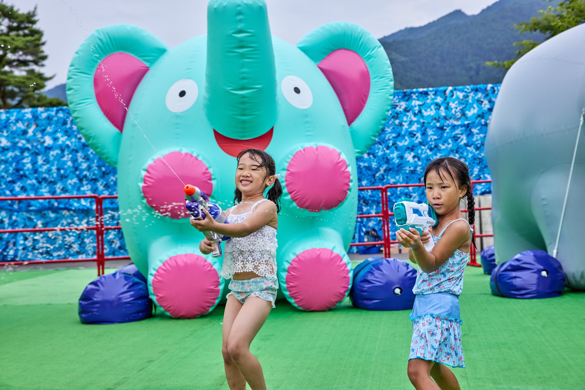 「じゃぶじゃぶパラダイス」は、「わんぱく・アニマル」をコンセプトにした、ゾウやキリンなどの動物を象った全6種類のジャンボバルーンプールで構成される夏季限定の水遊び広場です。オープン10周年となる本年は、高さ6メートルから滑ることができる大きなスライダーが並んだ「アフリカンスライダー」から、高さ20mもの水しぶきが豪快に上がる仕掛けが新登場します。