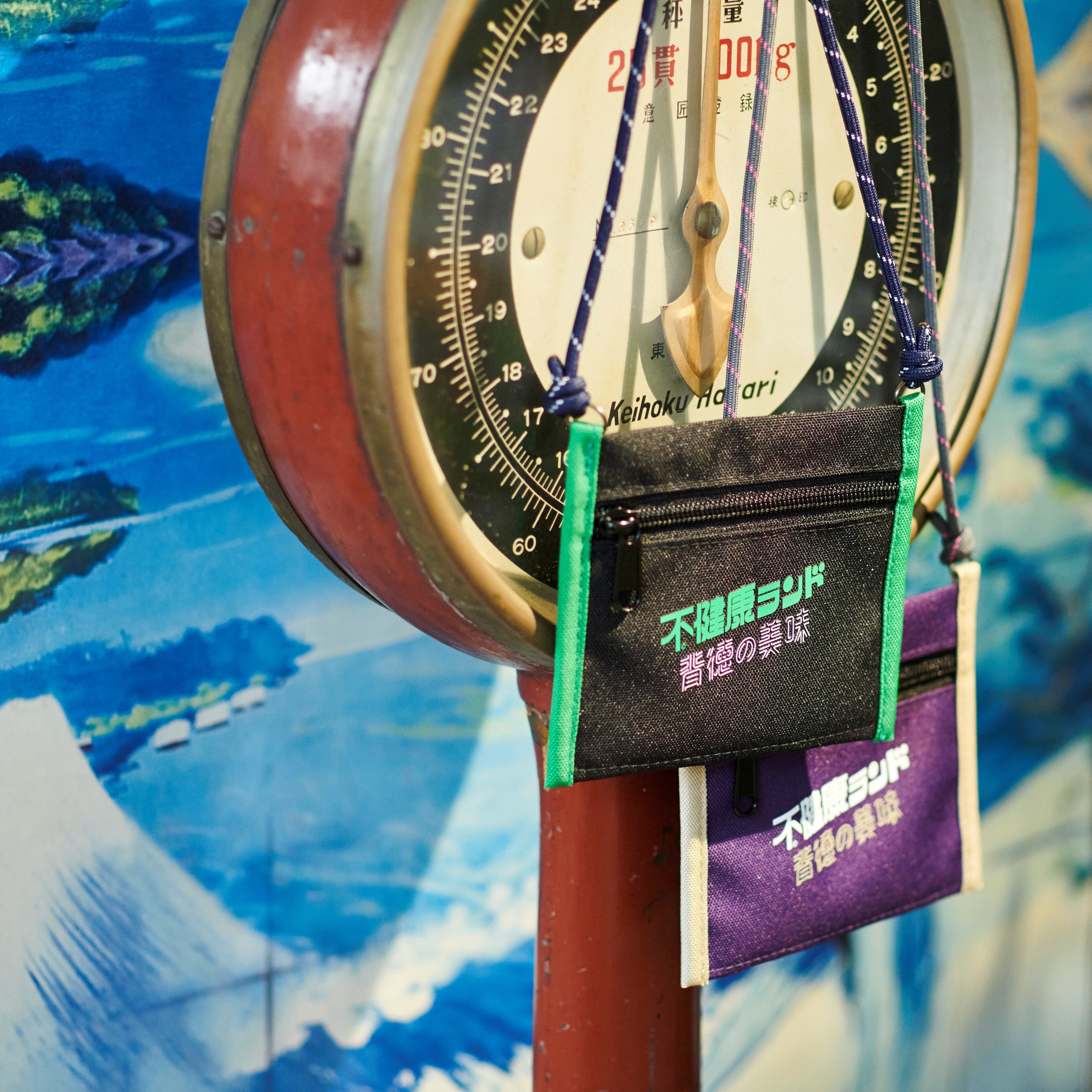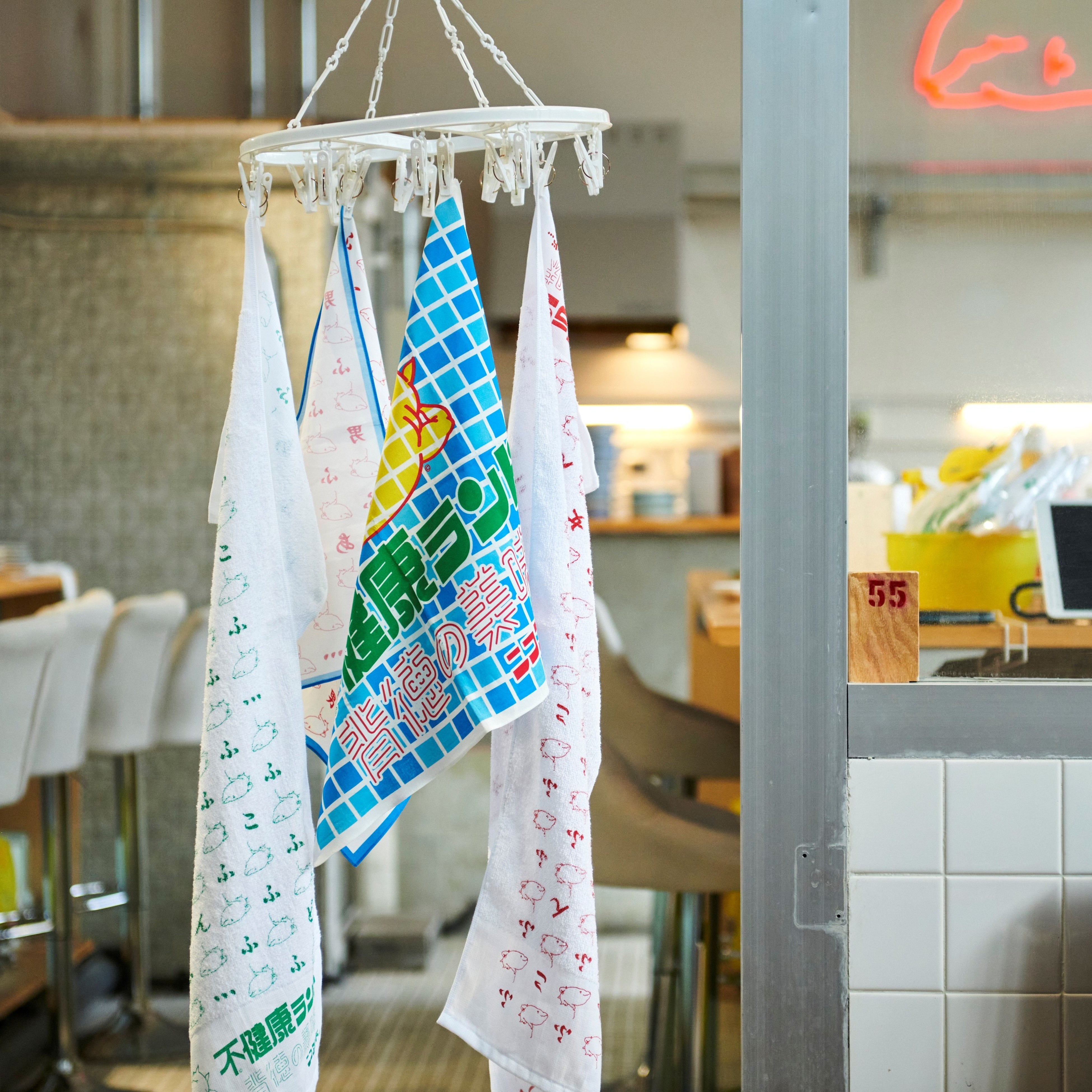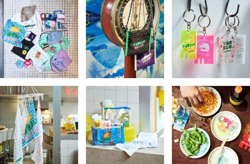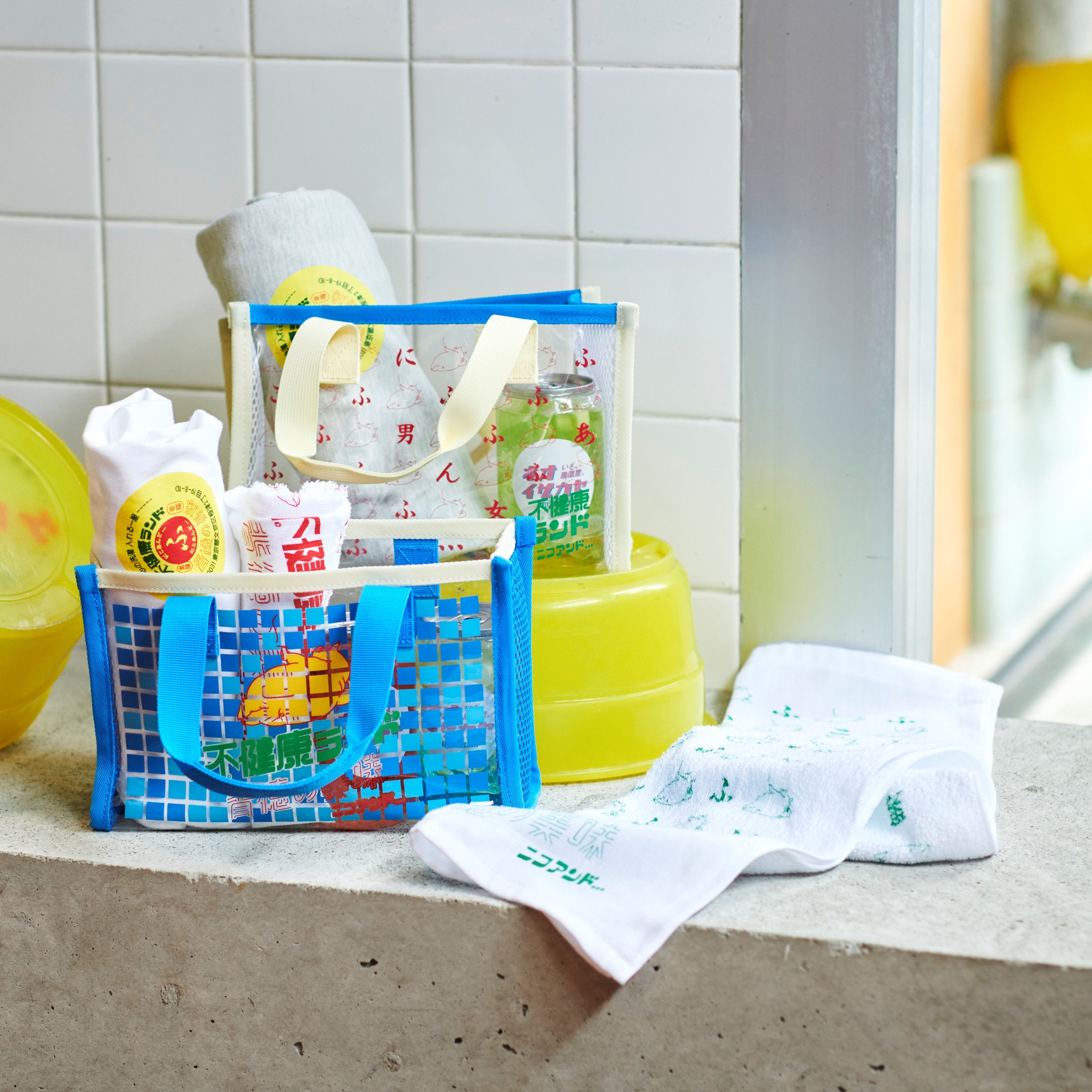 両店の看板デザインであるロゴやアイコンをプリントしたTシャツやハット、銭湯を改装した「不健康ランド」にちなみ、銭湯を彷彿させるロッカーの鍵のようなキーホルダーやコースター、スパやサウナにも使えるビニールバッグなど、懐かしくて新しい“ニュートロ”なアイテムを展開します。