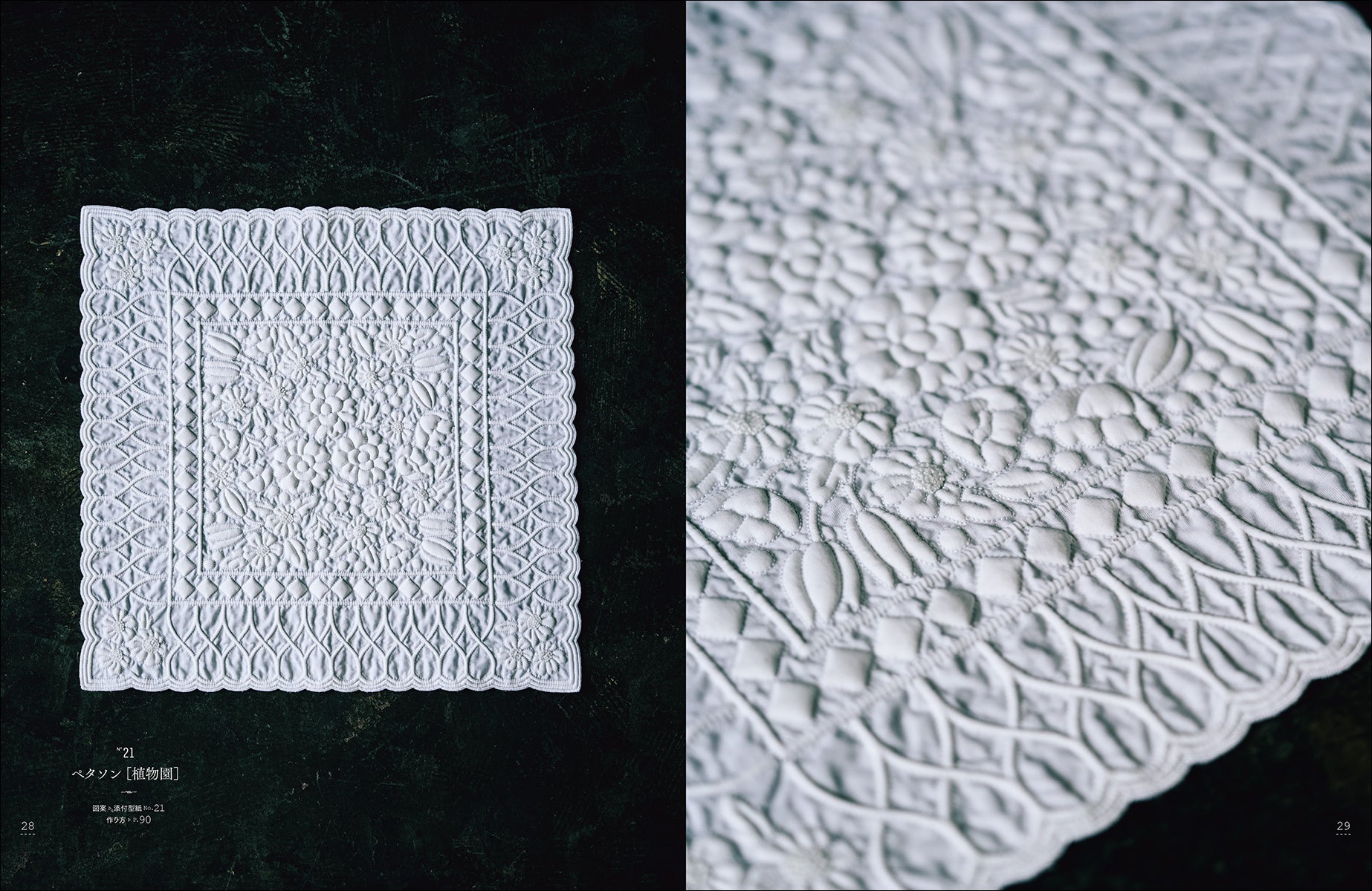 2枚の白いコットン生地を重ね、模様のステッチを施した後、布の間にコットンの詰め糸を通して立体的にモチーフを浮かび上がらせます。詰め糸が入ってふっくらした白い布にできる陰影や立体感から「布の彫刻」と呼ばれています。