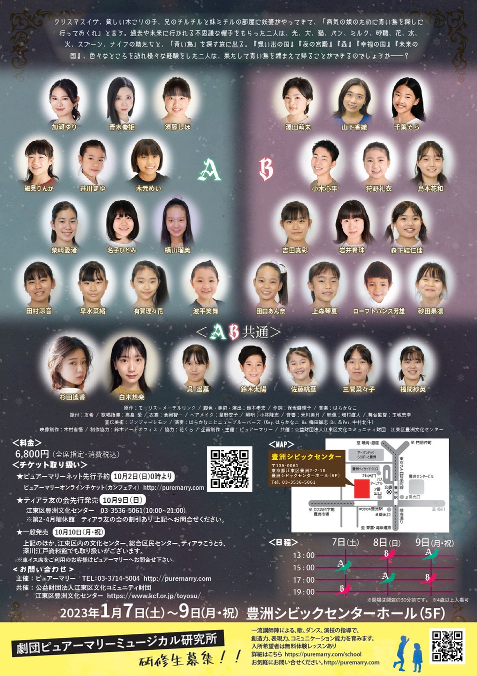 有限会社ピュアーマリー(東京都目黒区、代表:保坂 磨理子)主催、ピュアーマリーオリジナルミュージカル『青い鳥』が2023年1月7日 (土) ~2023年1月9日 (月・祝)に豊洲文化センター 豊洲シビックセンターホール(東京都江東区豊洲2-2-18豊洲シビックセンター)にて上演されます。