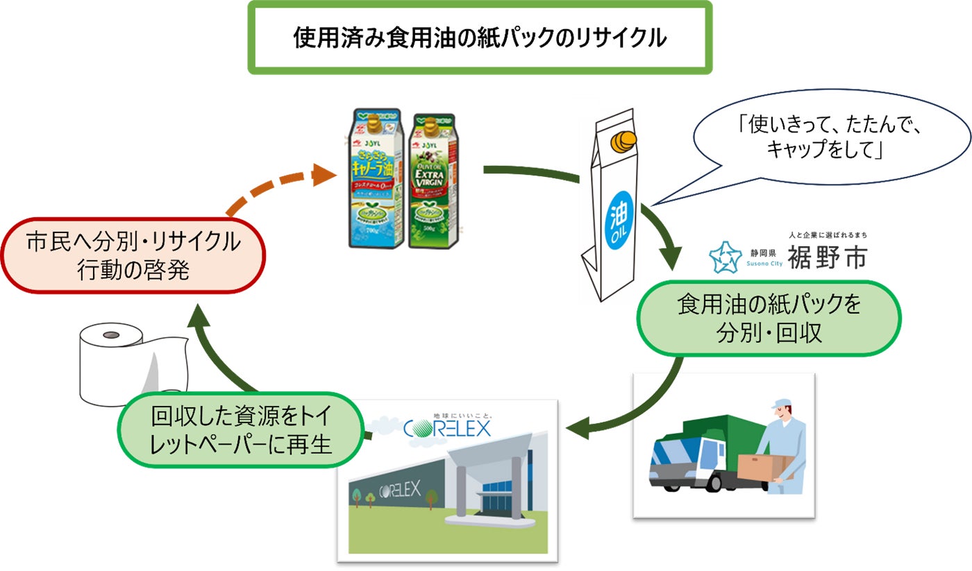今回、裾野市はコアレックス信栄と紙のリサイクルに関する協定を締結し、TOPPANとJ-オイルミルズがリサイクル適性検証を実施した食用油の紙パックを資源ごみの行政回収の対象として追加し、トイレットペーパーへのリサイクルを行います。また、生活者への排出方法の告知や啓発などの「環境コミュニケーション」を通して、食用油等の紙パックも貴重な紙資源として有効にリサイクルされることを生活者に伝え、生活者のリサイクル意識の向上を図ることで、幅広い液体用途で使用されている紙容器のリサイクルのさらなる社会実装を推進します。