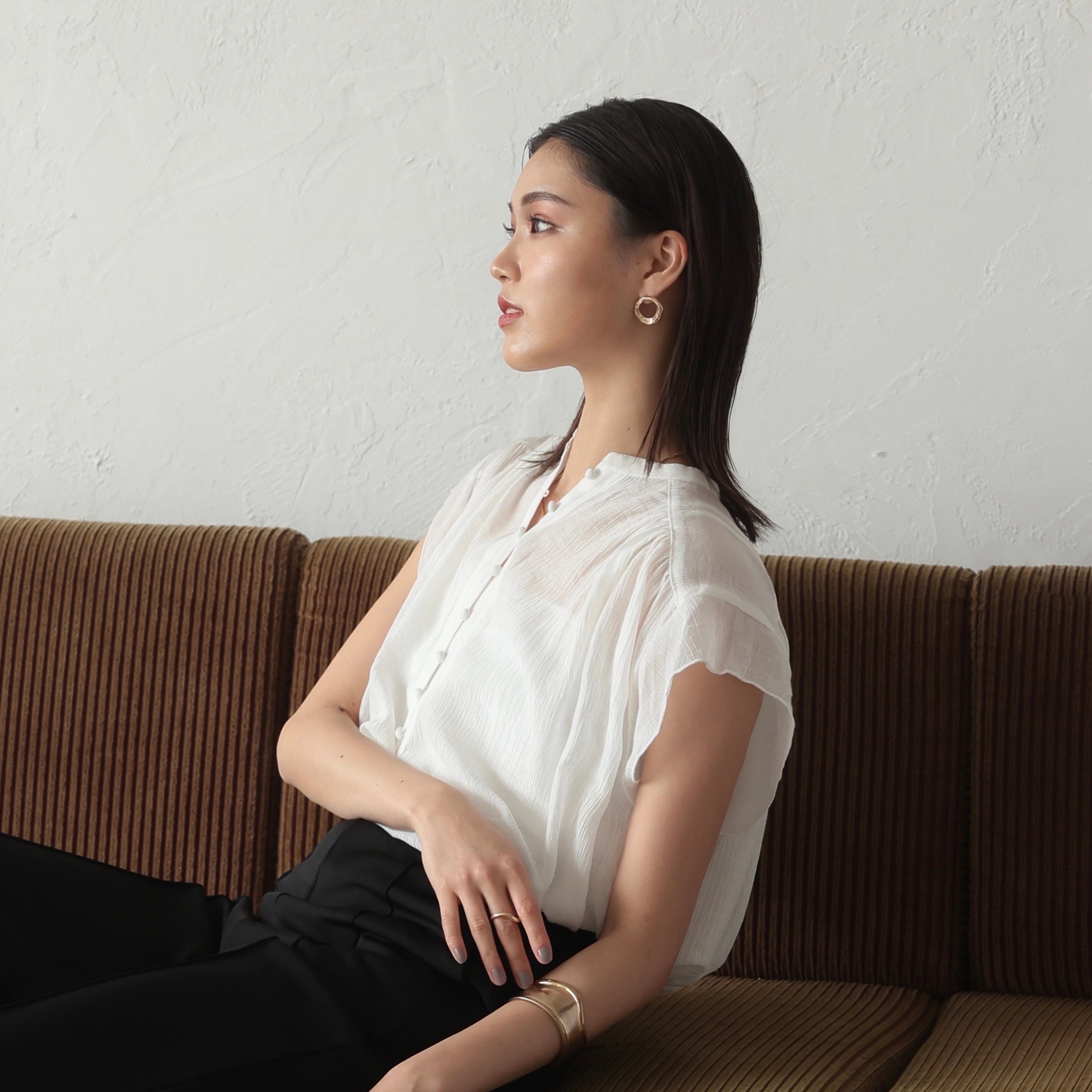また大人の肌にも映えて程よくツヤ感と落ち感のある素材は、暑い夏にぴったりのさらっとした肌触りを実現し、絶妙な袖の長さが気になる二の腕をカバーしてくれます。