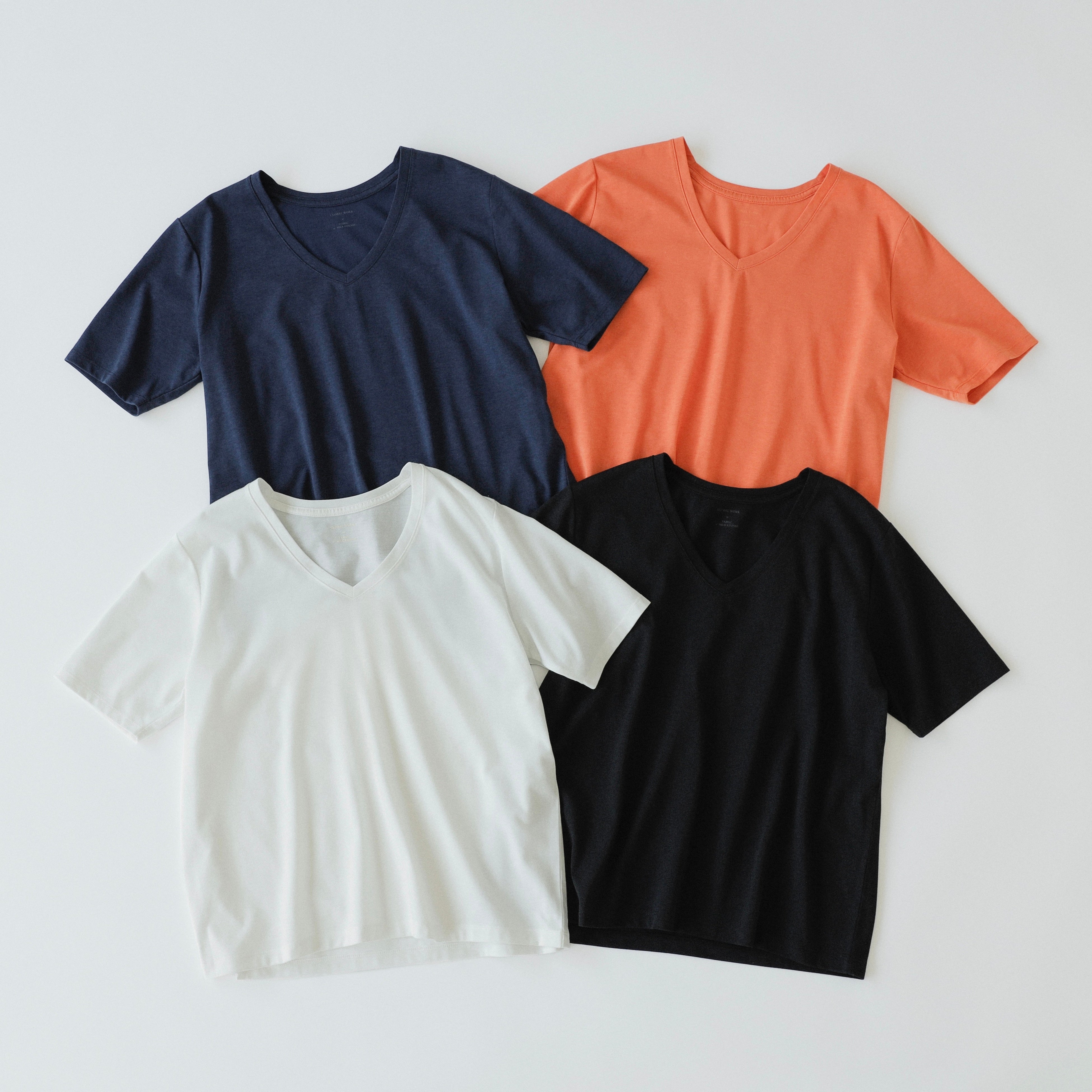“Vネック”がほど良い抜け感を演出しデコルテまわりが綺麗に見え、肌着に見えないよう“V”の深さと幅、また開き具合をこだわり抜いた1枚です。