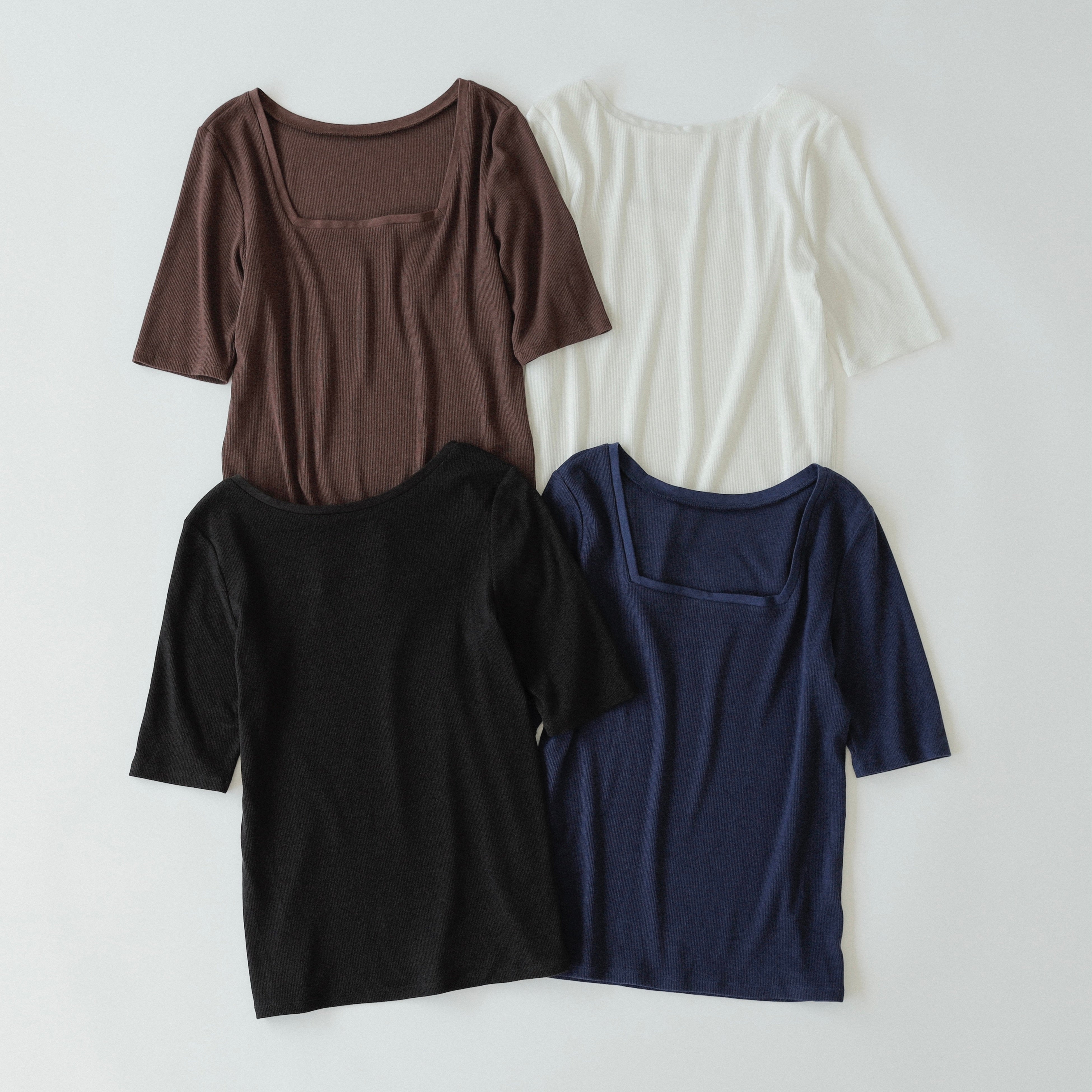 スクエアネックとボートネックの前後2WAYで着られるリブのTシャツを作りました。