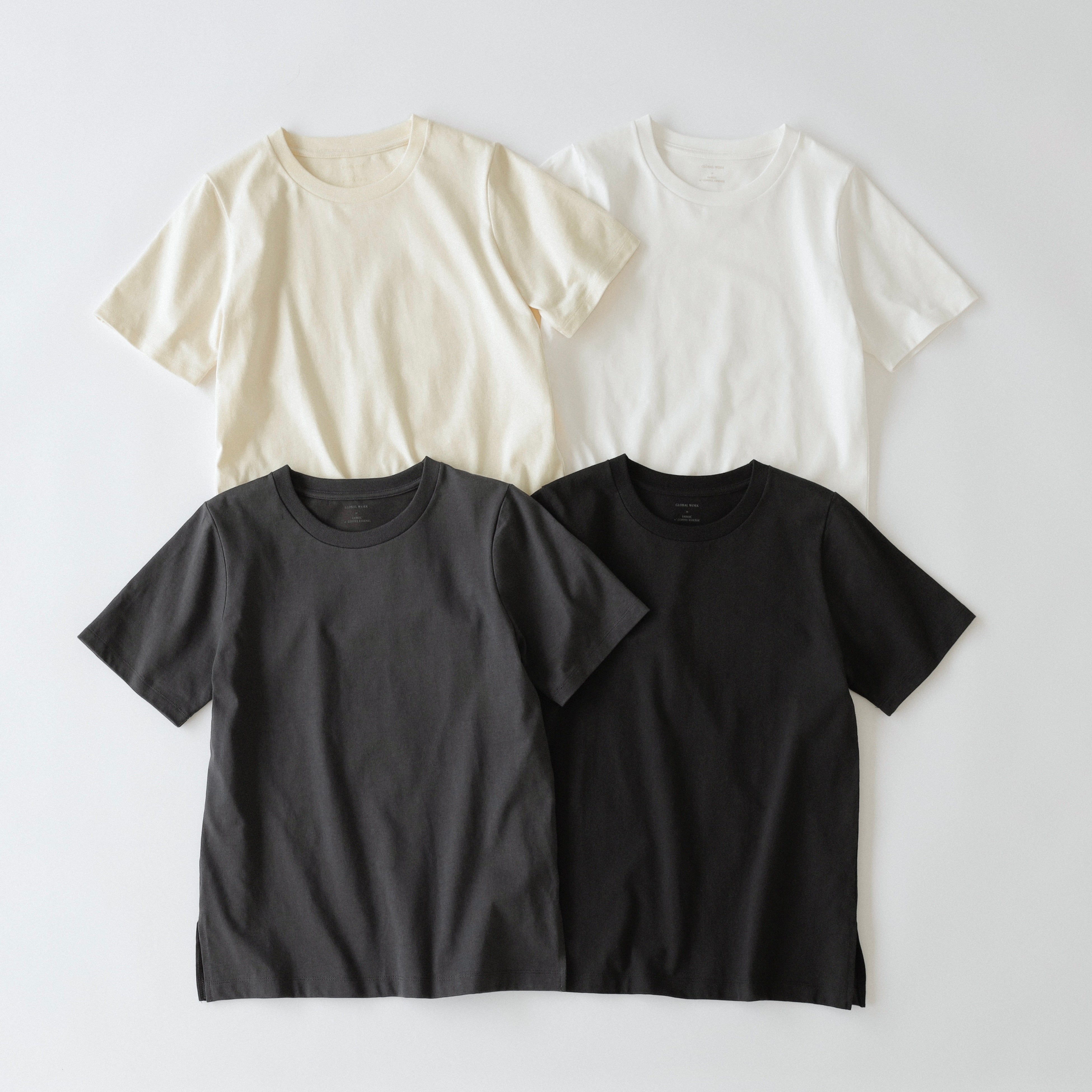 定番オブ THE Tシャツの“クルーネックタイプ”でサイズ感とカラーセレクトにこだわり抜いたTシャツを作りました。絶妙なサイズ感でほど良くゆとりを残しながらもジャストで着られるMサイズはサイドスリットも浅めに設定し前だけインも簡単に。
