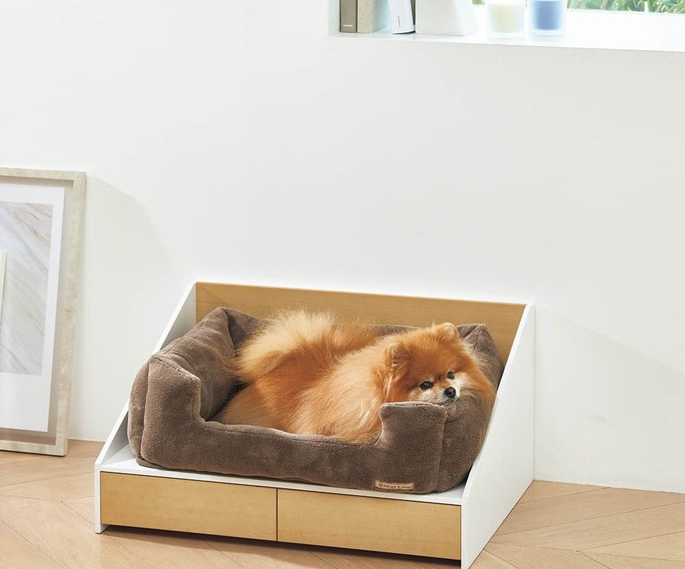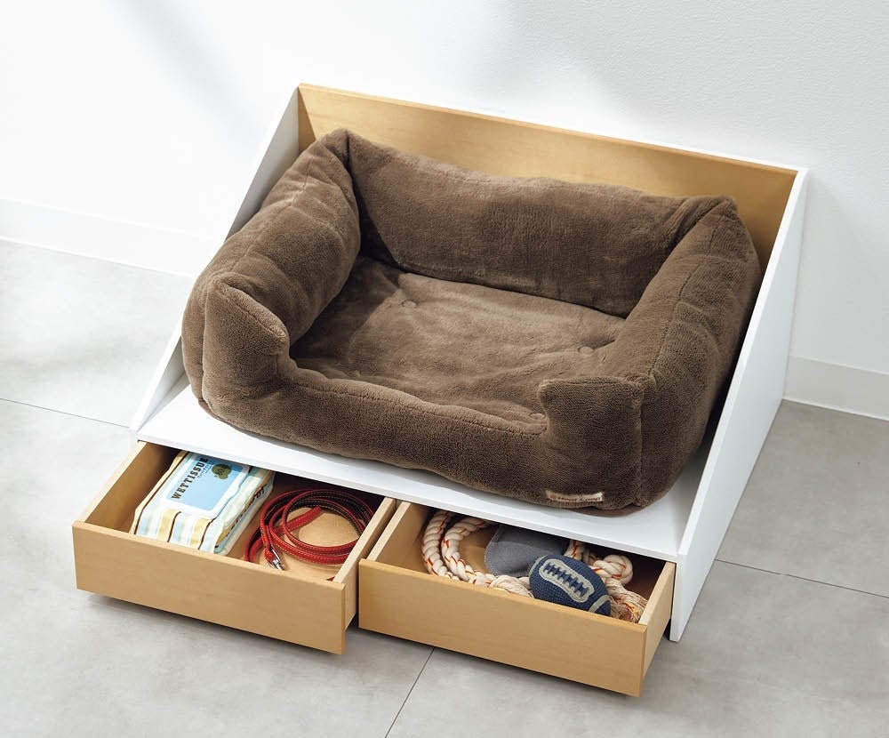 別売りのヒートループ®でつくったペットベッドをセットして使える、ペットベッドフレーム。少し高い位置にペットベッドを置くことで、間違って愛犬や愛猫を踏んでしまう危険性が減少します。奥側と左右のボードもしっかりガードします。下部にはおもちゃやリードを収納できる引き出し2杯付き。