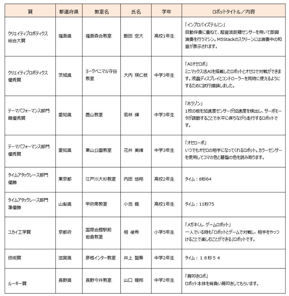 総合大賞は高校一年生の飯田 空大(いいだそら)さんが受賞。「インプロバイズテルミン」と題したオリジナルロボットで、自動伴奏に重ねて、超音波距離センサーを用いた即興演奏を行うロボットが受賞しました。