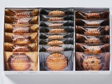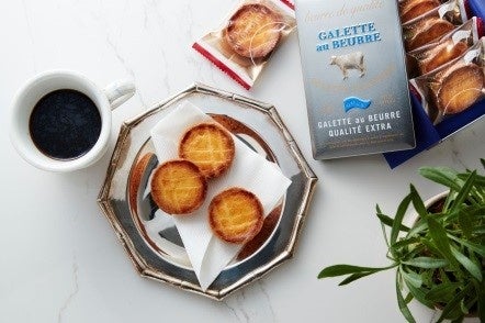 フランス語で“バターの焼き菓子”という意味の〈ガレット オ ブール〉。主役のバターはフランスイズニー社の発酵バターを使用し、バターをしっかり味わうことのできるさくさくほろほろ食感の焼き菓子。(上)発酵バターをたっぷりと使用したバターの香りと味わいがしっかりと感じられる厚焼きタイプのサブレ(A.O.P.認定の発酵バターを使用)。(下)バターの風味を楽しむフランスの伝統的なガレットの詰め合わせ。
