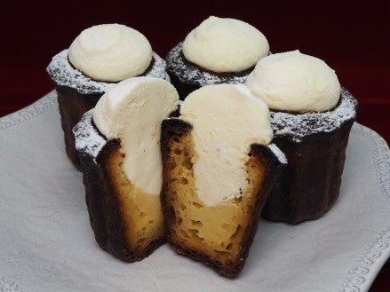 福岡発祥のカヌレ専門店。フランス定番のものから、福岡県産ブランド苺「あまおう」や、鹿児島県産ブランド緑茶「知覧茶」など、地元九州の素材を使用したものまで、常時8種類のフレーバーを展開中!バニラ風味のカヌレの中に、カスタードクリームをふんわりと絞った、冷やして食べる新食感カヌレです。