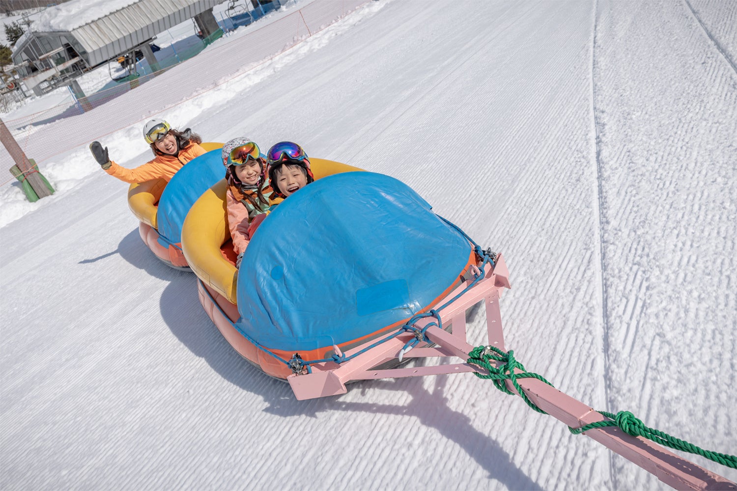 ファミリーで楽しく遊べるキッズスノーエリア。スノーチュービングやソリ遊びなどをお楽しみいただけます。