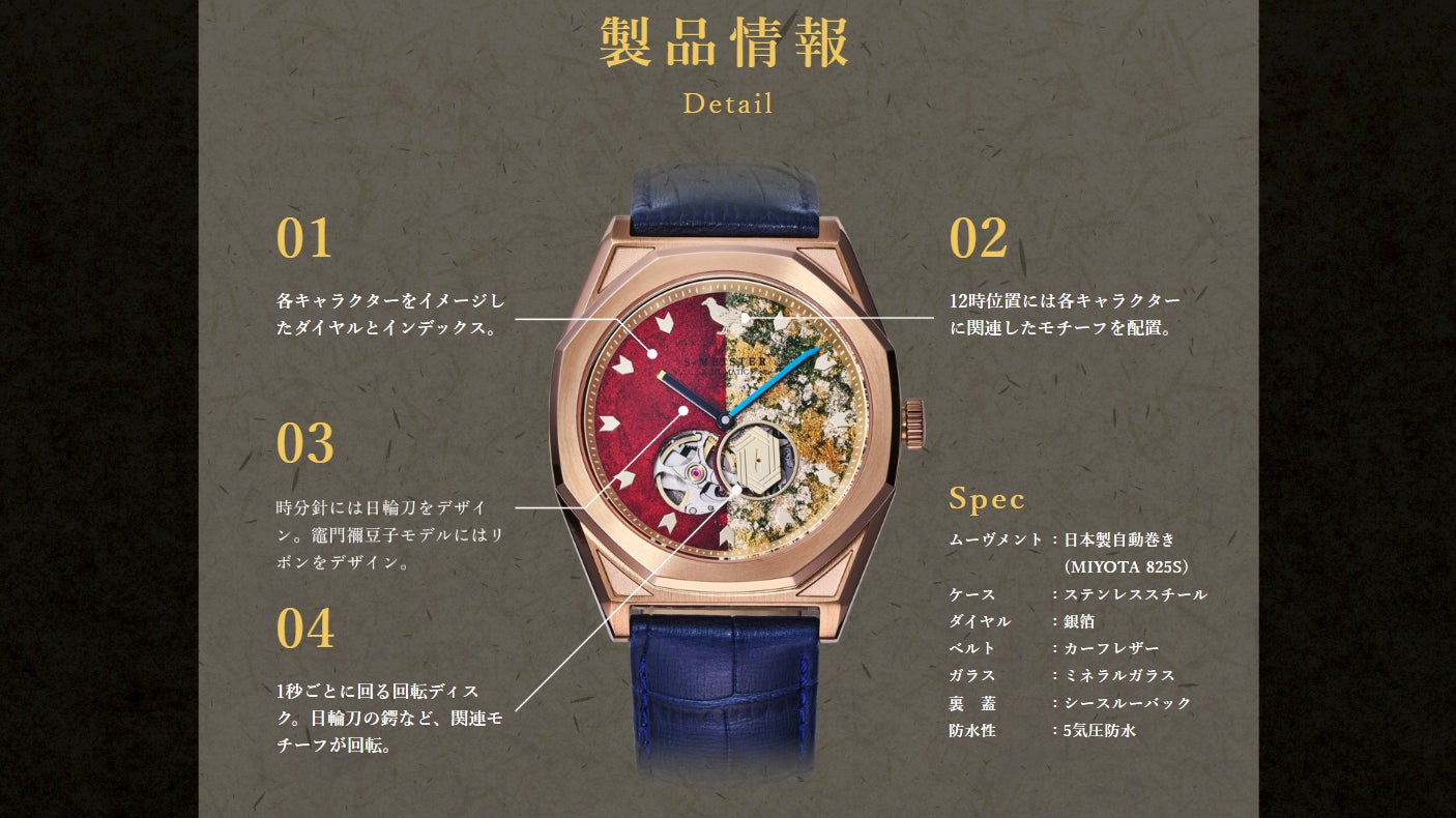 日本の伝統技術を駆使し、職人が1つ1つ仕上げた日本製の美しい機械式腕時計でアニメ「鬼滅の刃」のキャラクターを表現した逸品。