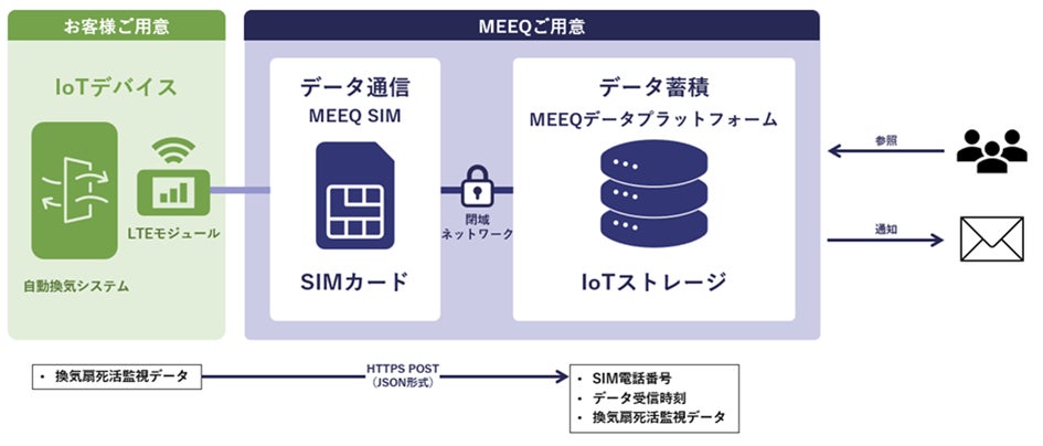 2025年2月末までに、CO2換気制御機器を導入する約1,100店舗のうち約450店舗に、CO2センサーの正常な作動を確認するための遠隔稼働監視システムを、ミークの『MEEQ SIM』『MEEQデータプラットフォーム IoT ストレージ』により実現し、追加導入いたします。CO2センサーの状態を『MEEQ SIM』で『MEEQデータプラットフォーム IoT ストレージ』に送信、センサーの稼働状況を視覚的に把握します。また、IoTストレージの通知機能により、異常を検知した場合にはメールで通知されるため迅速な対応が可能になります。遠隔稼働監視システムは節電効果を継続するために効果的です。