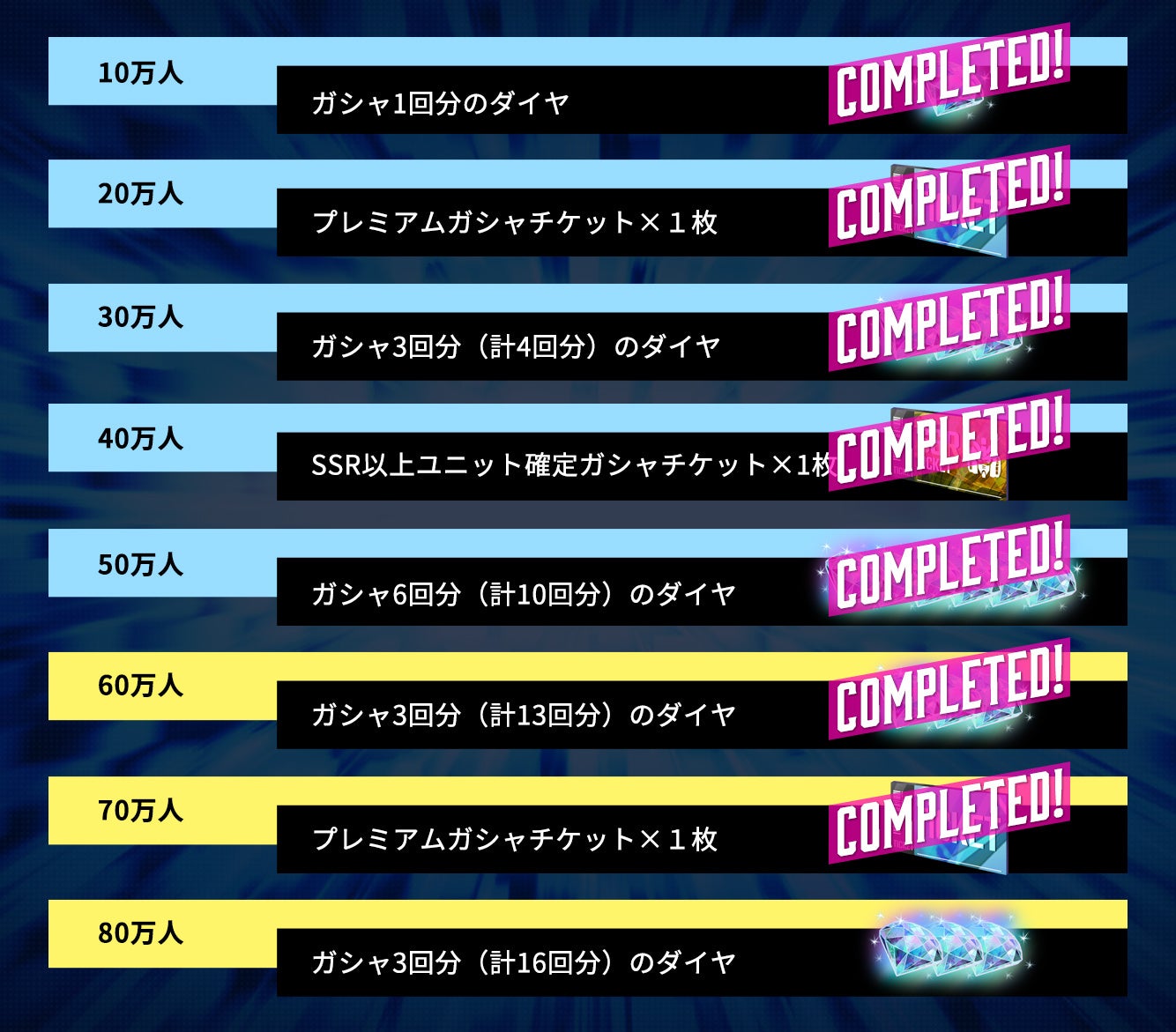 400,000人突破⇒SSR以上ユニット確定ガシャチケット×1枚 達成済