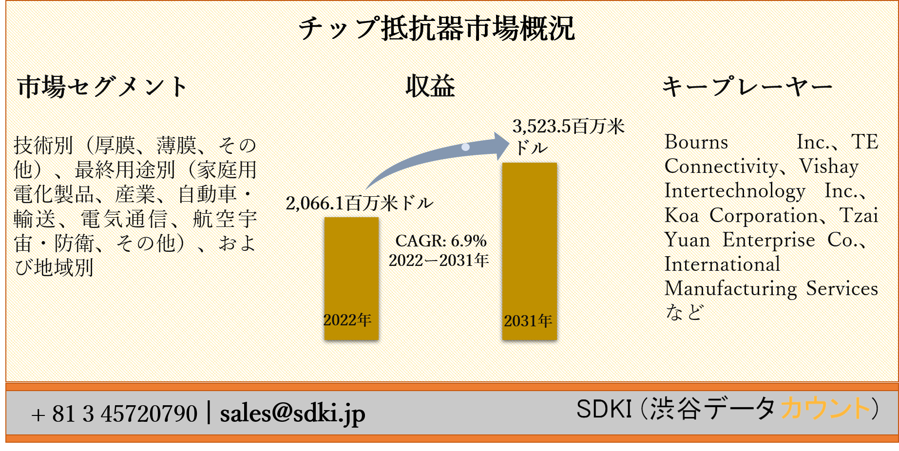 SDKI Inc.が「チップ抵抗器市場ー予測2022ー2031年」の新調査レポートを2022年01月04日に発刊しました。レポートは、業界の新ビジネスチャンスとともに、市場とその成長見通しの完全な評価を提供します。さらに、2022ー2031年の予測期間中の市場規模と年間成長率が含まれています。