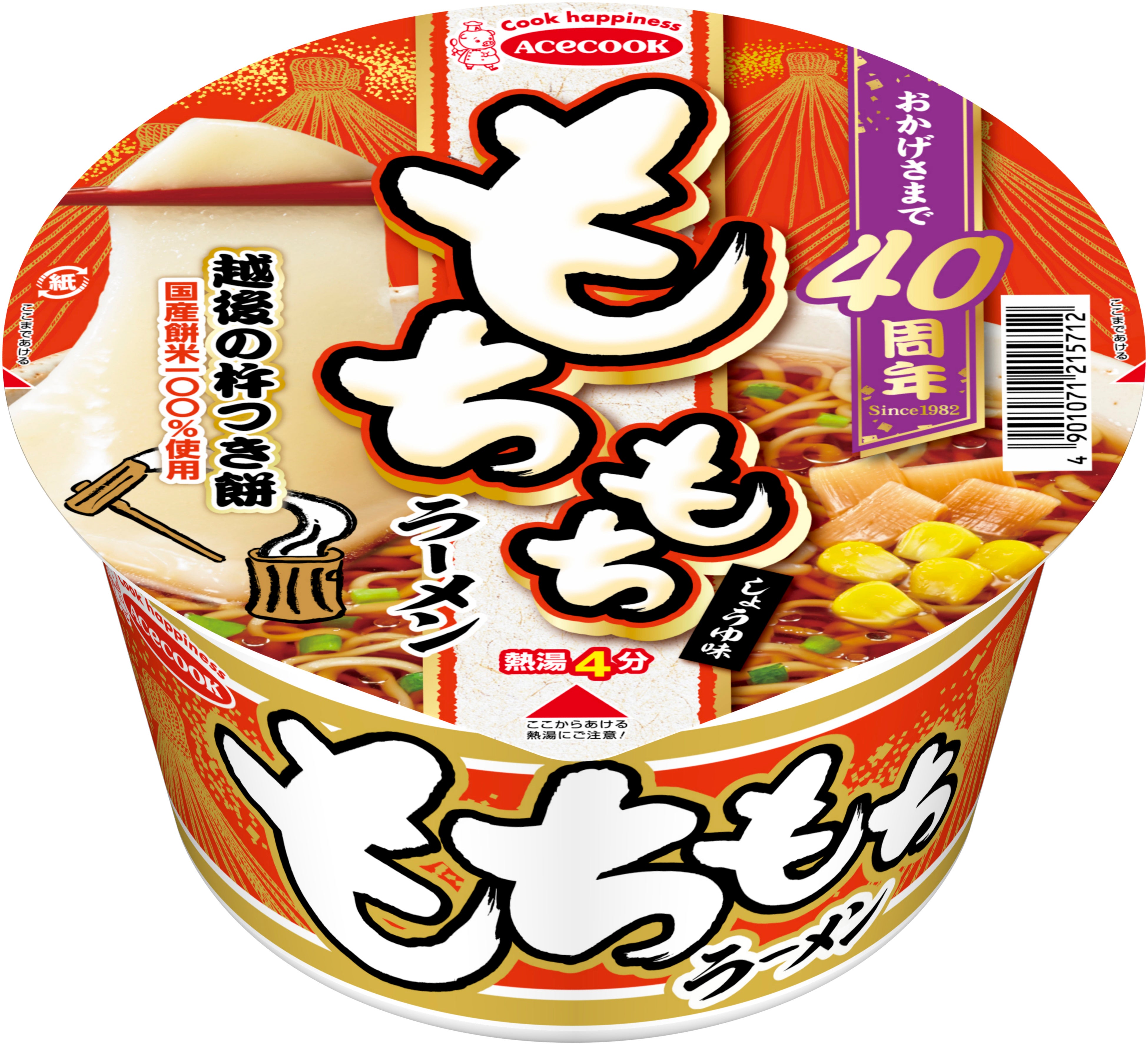 「もちもちラーメン」は今年で発売40周年を迎えます。これを記念し、北陸に馴染みのある雪吊りをあしらった背景はそのままに、「おかげさまで40周年」の周年ロゴを加え、長年ご愛顧いただいているお客様への感謝の気持ちを表現したパッケージで販売いたします。