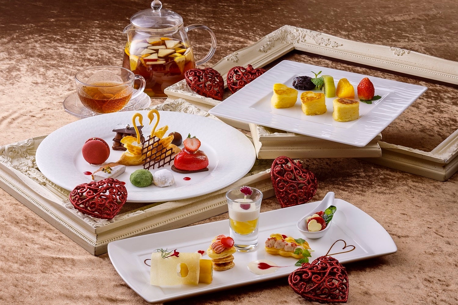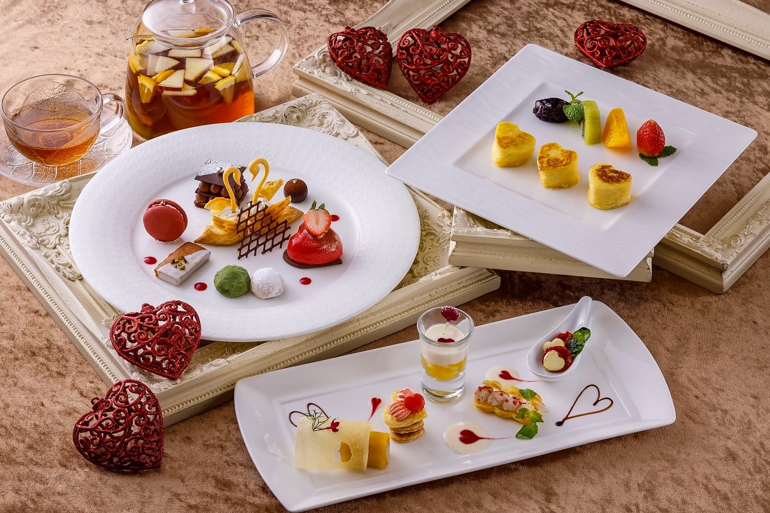 ふっくらと焼き上げたシュー生地に、二種のチョコレートムースとホイップクリームを詰めた小さなスワンシュークリーム、なめらかな口溶けの生チョコレートなど繊細な味わいのスイーツ、エクレア風のチキンムースやハート型のミートパイなど可愛らしい見た目も楽しめるアミューズなど、彩り華やかなメニューの数々をコース仕立てで提供します。