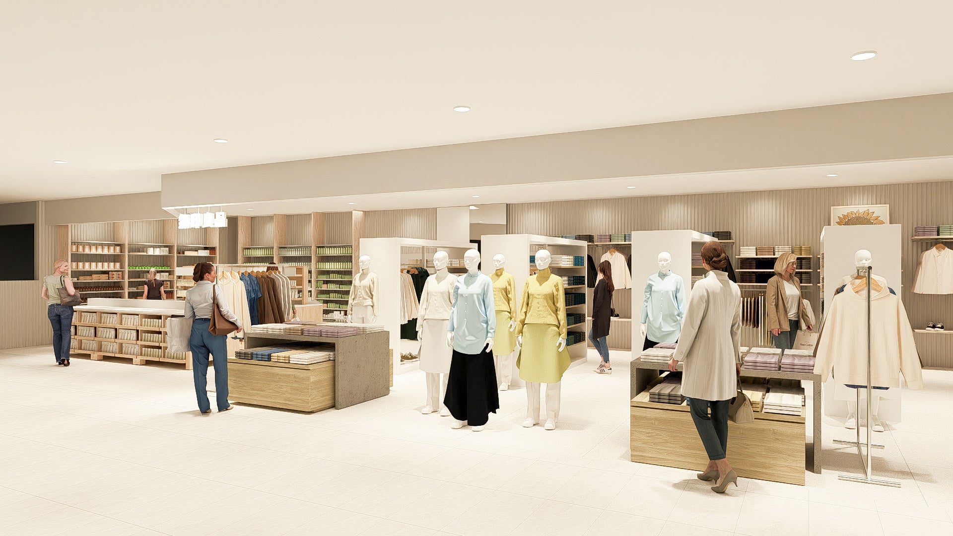 コロナ禍以降、身だしなみとして服だけでなく、素肌への意識が高まっており、「無印良品 ルクア大阪」は、ファッションや美容に対する感度が高い社会人や学生が多く集う梅田に位置していることから、衣料品とコスメ・ケア用品を中心とした品揃えに変更することにいたしました。店舗では、衣料品のコーディネートやスキンケアの専門知識を持つスタッフがお客様1人1人の要望に合わせた商品の提案を行います。また、衣料品とコスメ・ケア用品の素材感や色味が見やすく買いやすい店舗環境を目指し、従来よりも床や壁素材のカラートーンを抑えた設計としています。
