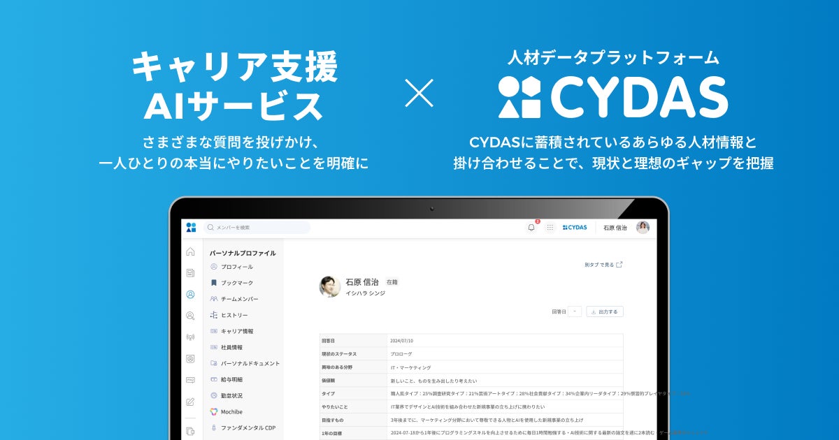 株式会社サイダス(本社:東京都港区、代表取締役:松田 晋、以下 サイダス)は、自社が開発・販売する人材データプラットフォーム「CYDAS(サイダス)」と、TISインテックグループのTIS株式会社(本社:東京都新宿区、代表取締役社長:岡本 安史、以下 TIS)が提供する「キャリア支援AIサービス」との連携を開始しました。