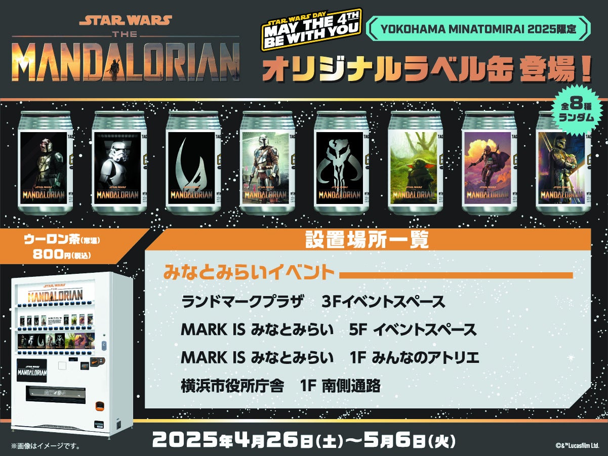 「STAR WARS DAY YOKOHAMA MINATOMIRAI 2025」限定の“STAR WARS マンダロリアン オリジナルラベル缶(ウーロン茶)”(全8 種<ランダム>)を購⼊できる⾃動販売機が市庁舎1階にも設置されます!イベント限定のレアアイテムとなりますので、この機会をお⾒逃しなく!