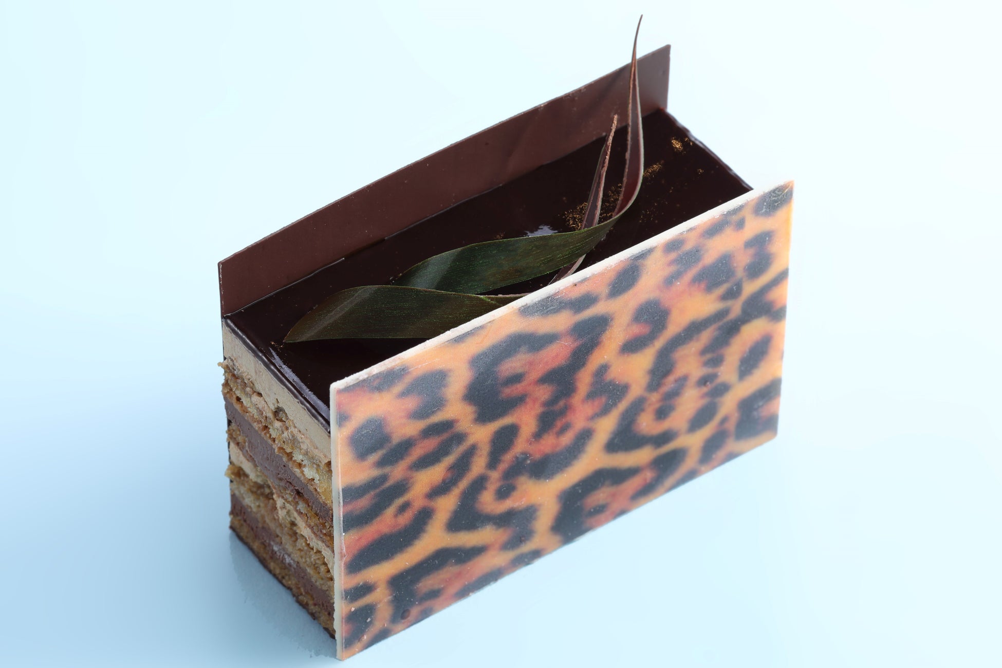 チョコレートケーキの定番「ガトー・オペラ」をジャガー柄のチョコレートでサンドしました。チョコレートの柄は両サイド異なり、片方はジャガーのロンくん、もう片方は小春ちゃんをイメージしています。