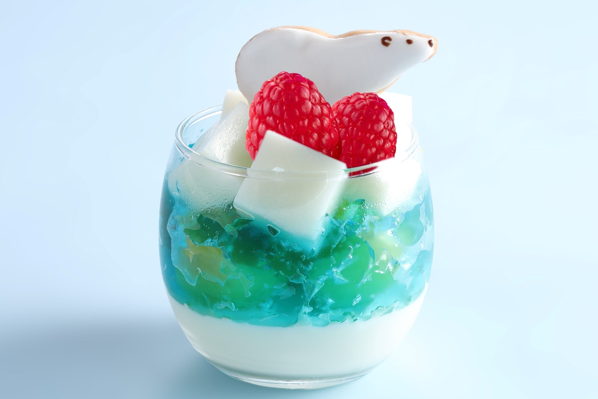 パンナコッタの上にフルーツとブルーハワイのジュレを流し、流氷に見立てた杏仁豆腐をトッピングしました。ホッキョクグマのホウちゃんが水辺で遊んでいる様子をイメージした、見た目も涼しげなグラスデザートです。