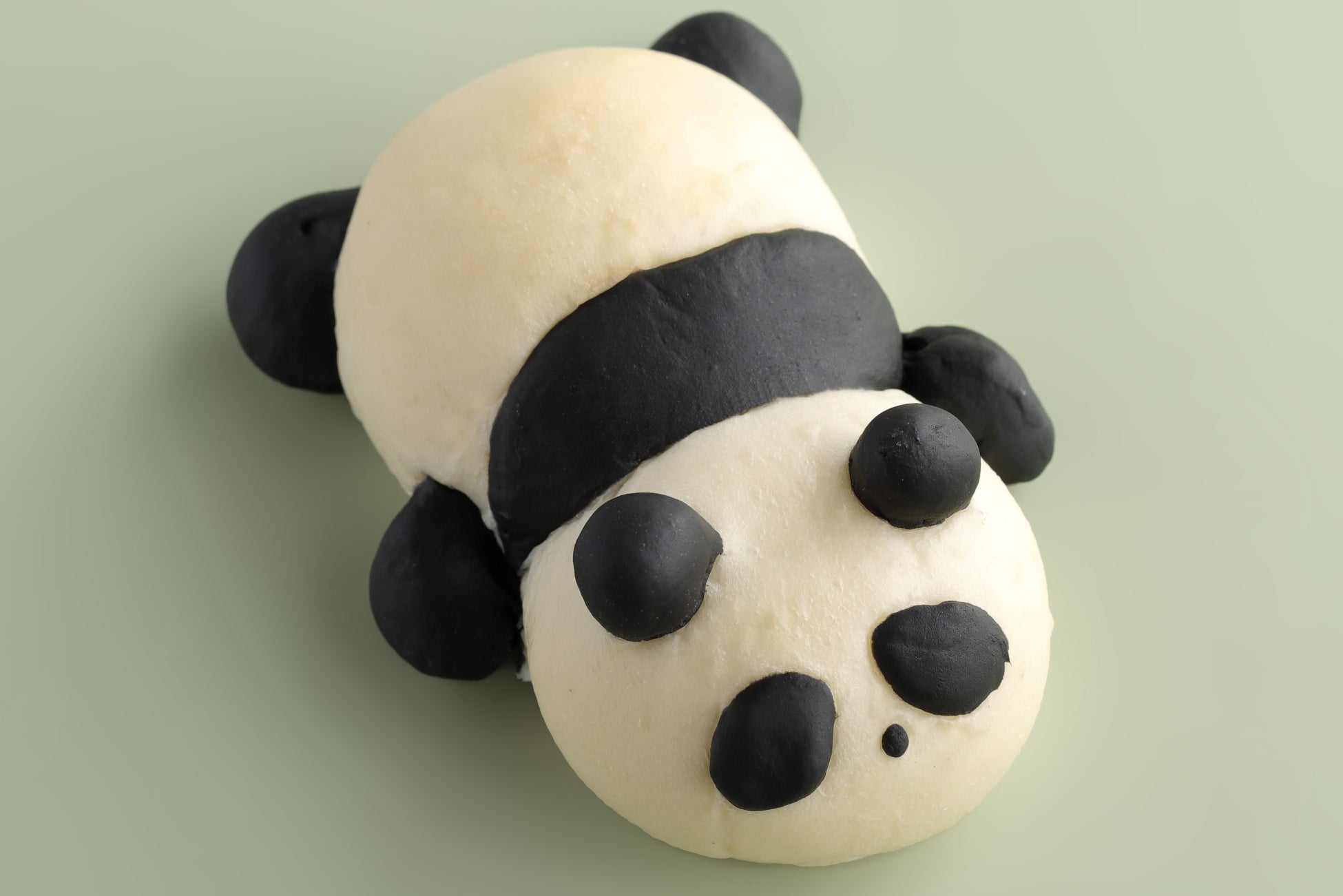 寝そべった姿がかわいいパンダパン。もっちりとした食感のミルク生地に竹炭を練り込んで作った目や耳などを付け、チョコカスタードクリームを入れて焼き上げました。