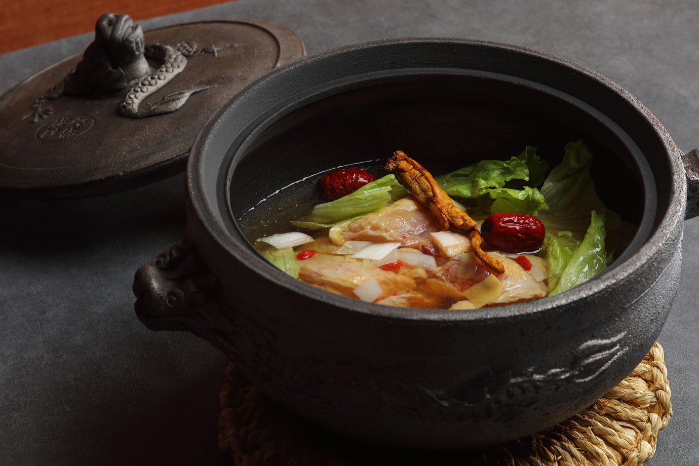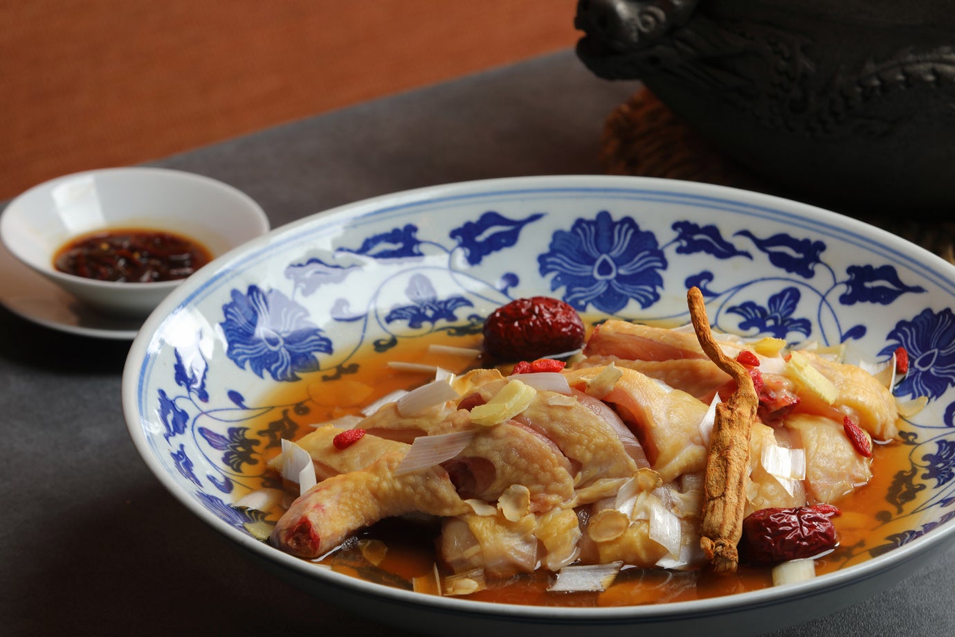 コースの終盤に登場する「酔鶏鍋」(酔っ払い鍋)は、オーダーが入ってから鶏肉を紹興酒と香辛料に漬けます。「酔鶏」とは文字どおり鶏肉を “酔わせて” 作られ、冷菜として食されることも多い料理です。「酔鶏鍋」は旨みのある対馬地鶏を使い、金華火腿、豚の脛、龍眼(ロンガン)党参(トウジン)など、様々な香味野菜と一緒に炊いた鍋で「アメリカ人参」の良い香りが特徴的です。