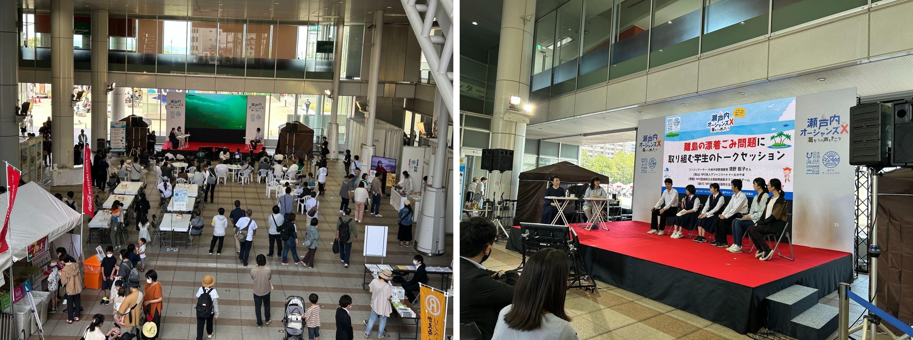 このイベントは瀬戸内海の海洋ごみ問題などに積極的に活動を行っている方をたくさんお招きして開催されました。ステージでは離島の漂着ごみ問題に取り組む学生のトークセッションと題して岡山県・愛媛県・香川県で活動する高校生がファシリテーターの九州大学大学院准教授 清野聡子さんとトークセッションを行ったり、現役の漁師さんによる海洋ごみ座談会、都市の散乱ごみ対策の座談会を行ったりと様々な目線で瀬戸内海についてのお話を聞くことができました。