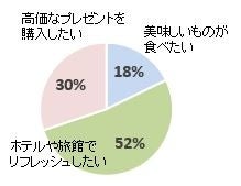 Q1: 1年間頑張った自分へのご褒美に何したい?A1. 美味しいものが食べたい 18%、ホテルや旅館でリフレッシュしたい 52%、高価なプレゼントを購入したい 30%