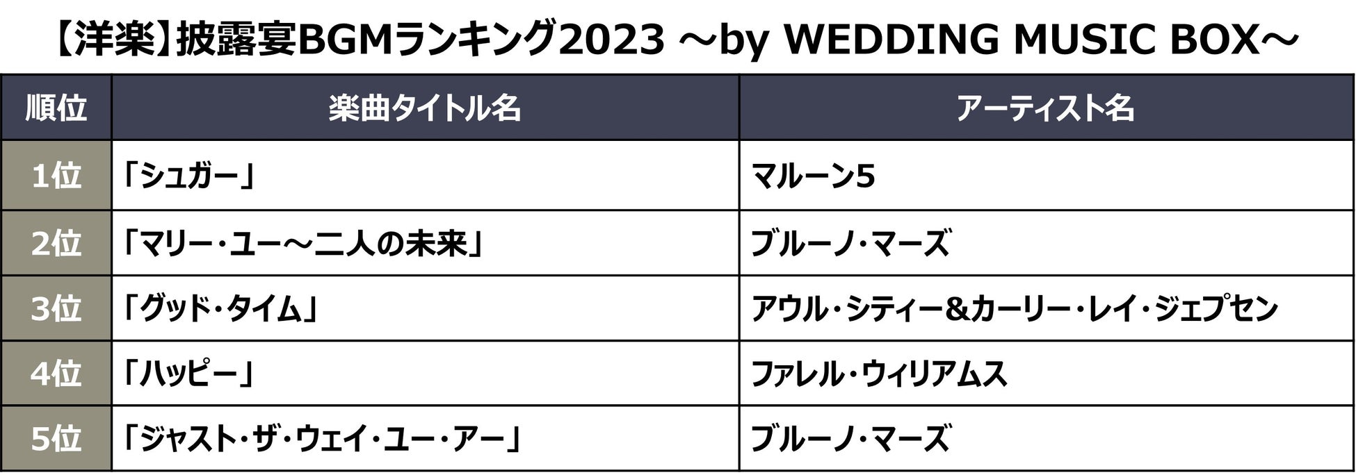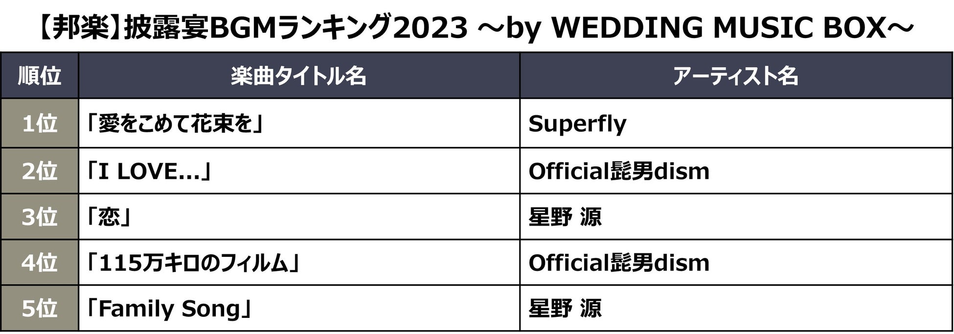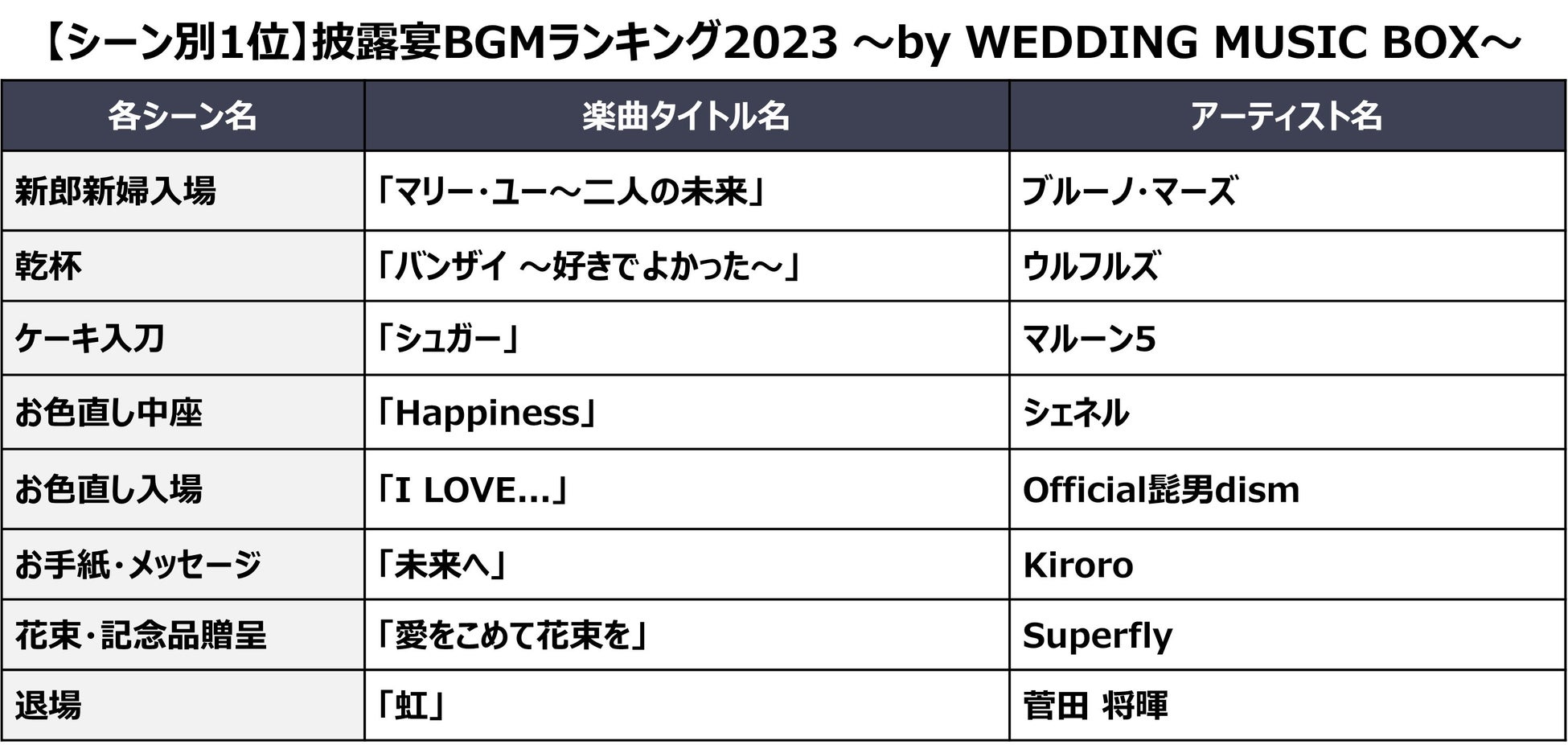 いい夫婦の日に「披露宴BGMランキング2023」を発表!披露宴BGMサービス『WEDDING MUSIC BOX』 1周年記念~この1年、結婚式・披露宴で最も流れた楽曲は?~