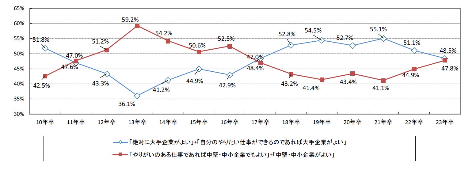 学生の大手企業志向は48.5%(前年比2.6pt減)となり、21年卒調査で過去最高値となってから2年連続で減少した。対する「中堅・中小志向」は前年比2.9pt増の47.8%となった。その会社でやりがいのある仕事ができることを重要視し、実現できるのであれば大手企業であることにこだわらない、という学生の傾向が読み取れる。【図2】