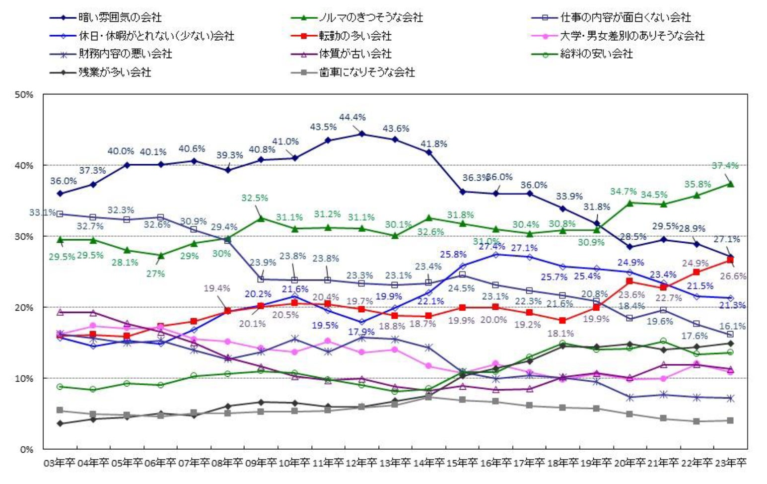 - 学生が行きたくない会社は「ノルマのきつそうな会社」が今年も最多。ライフスタイルの変化により、「転勤の多い会社」も増加【図5】