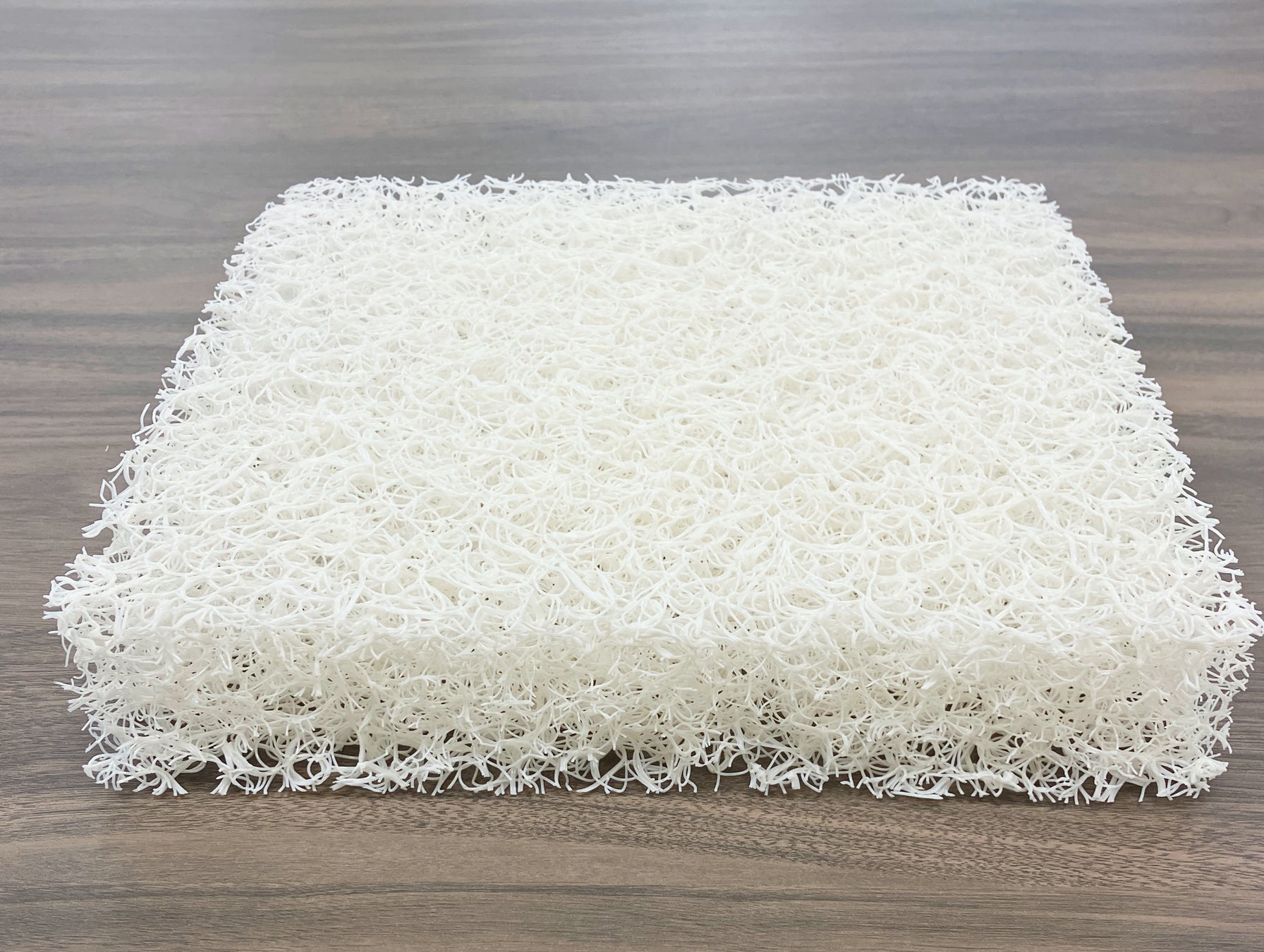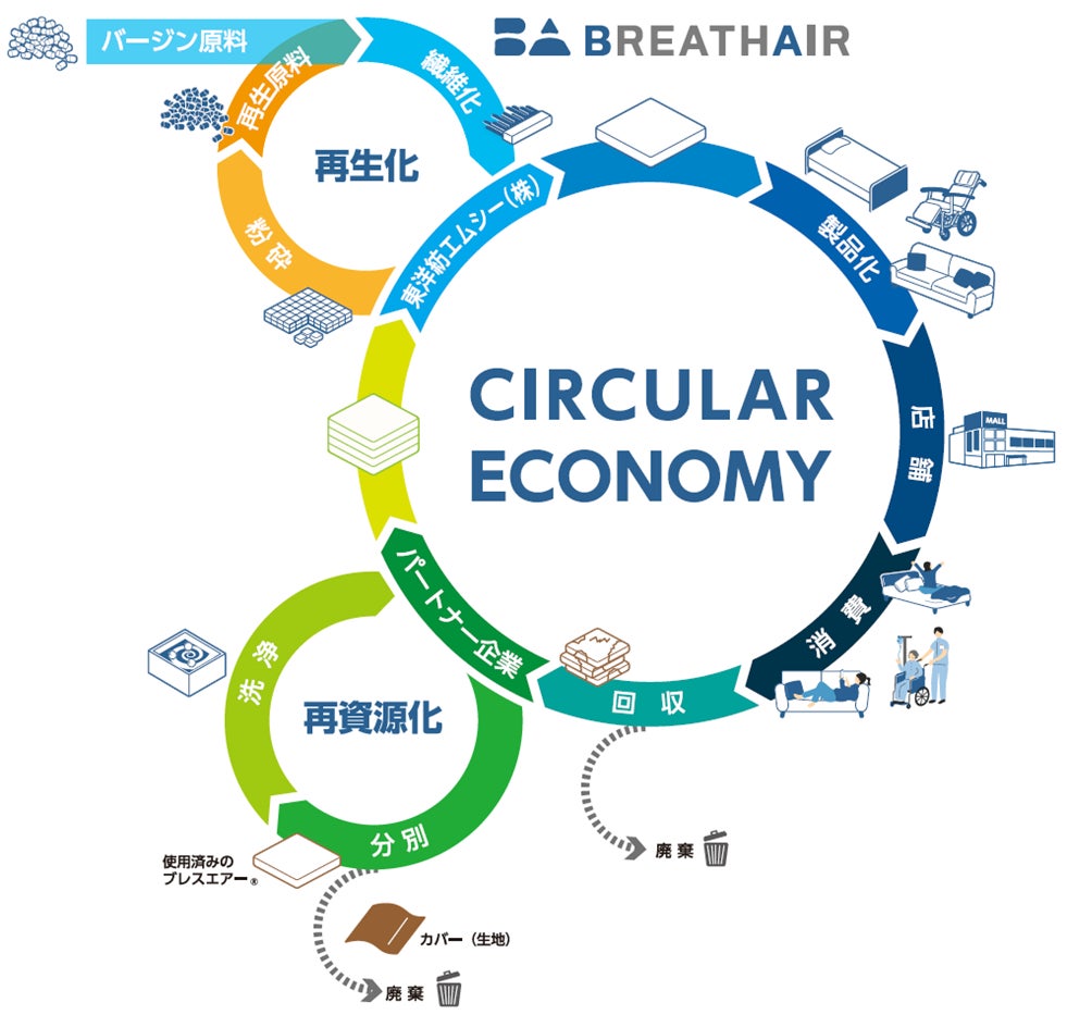 東洋紡エムシーが提供する「ブレスエアーメビウス®」は、市場から回収した使用済みの「ブレスエアー®」に由来する再生化材料を重量比で25%配合した製品。公益財団法人日本環境協会の環境ラベル「エコマーク」を取得。品質面でも従来品と同等のクッション性を実現し、機能性や快適性は「ブレスエアー®」とほぼ同等。これまでは使用済み業務用製品を由来としていたが、東洋紡エムシーとしても、一般消費者が使用した製品を回収し再生化する試みは、本プログラムが初めて。