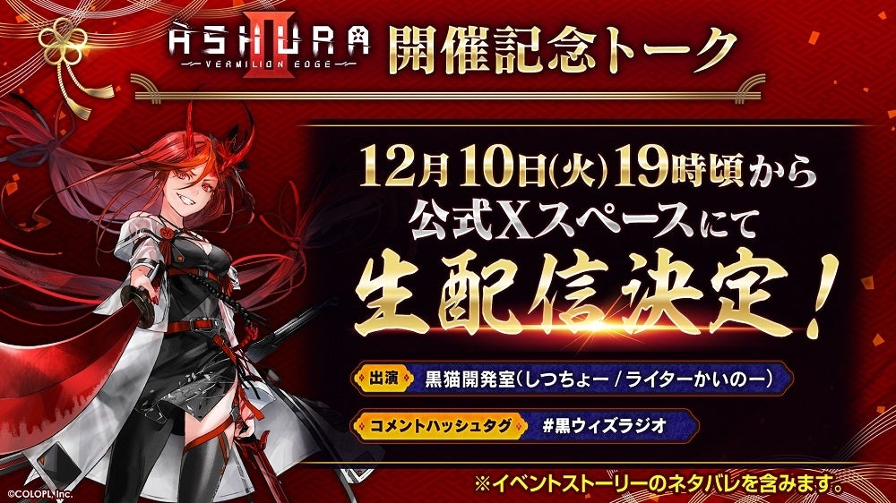 株式会社コロプラ(代表取締役社長:宮本貴志、本社:東京都港区、以下『コロプラ』)は、スマートフォン向けゲーム『クイズRPG 魔法使いと黒猫のウィズ(以下、『黒猫のウィズ』)』にて、2024年11月29日(金)より「ASHURA:VERMILION EDGEⅡ」を開催しております。また、12月10日(火)に初のXスペース生配信を決定いたしました。