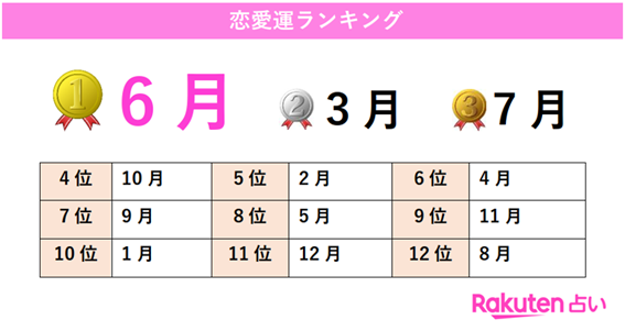 まず紹介する恋愛運ランキングでは、6月生まれの人が1位となりました。次いで、3月、7月と続きます。6月生まれの人は「2022年が最高潮」とのコメントもあり、翌年以降に急降下しないよう心がけつつ楽しむと良いようです。8月生まれの人は、恋愛以外のことに力を入れる方が実りがあるとのことでした。以下の通り、2022年の恋愛運について総括するコメントもありました。