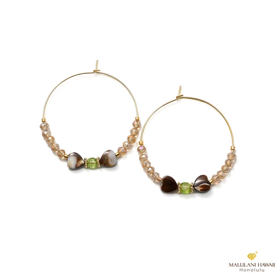 マザーオブパールとペリドットをあしらったピアスは、調和と希望の輝きをプラス。