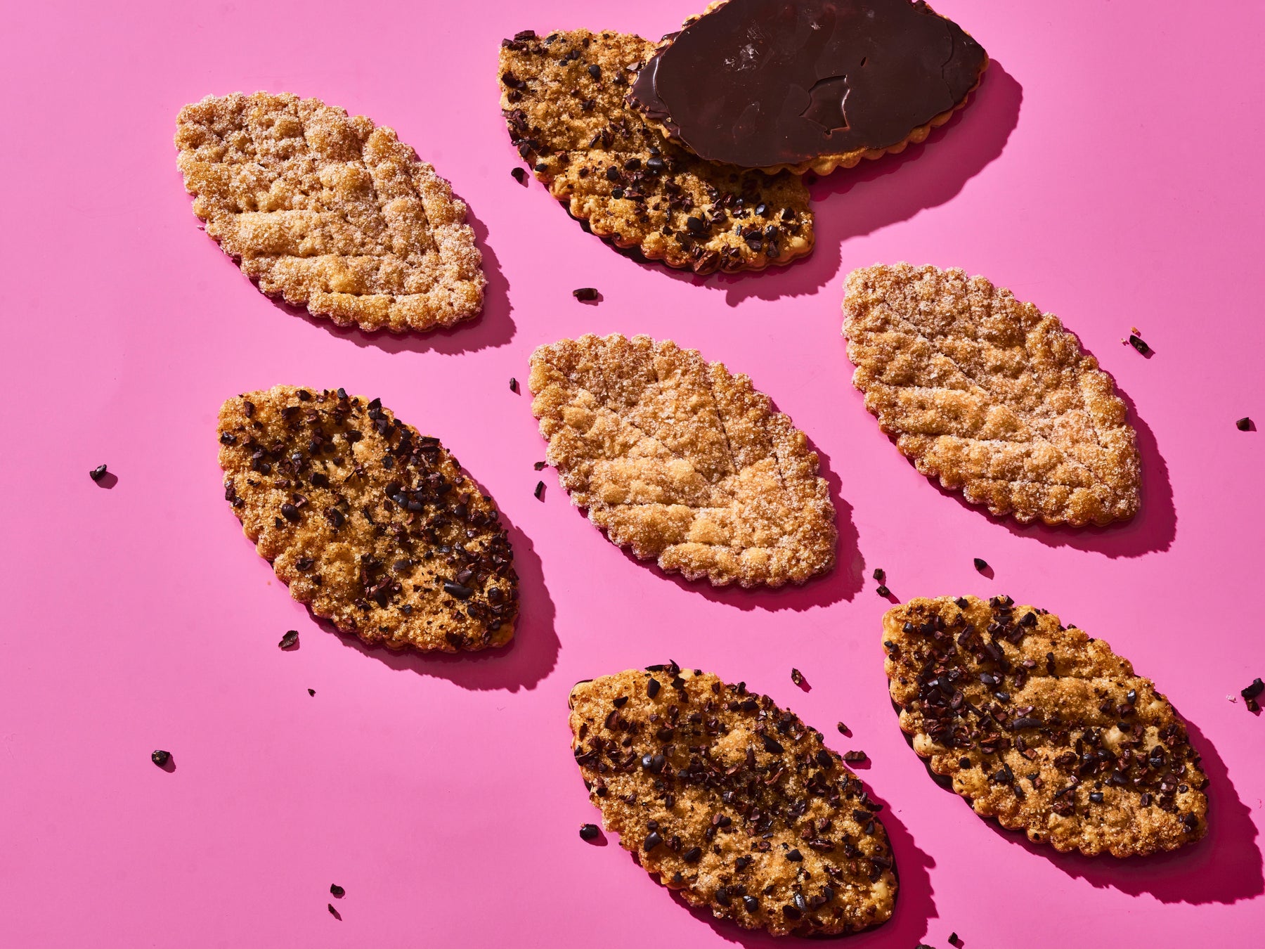バターをたっぷりと折り込んだ生地を、さっくりと焼き上げたリーフパイ。期間限定でご用意するショコラ味は、表面にカカオニブを贅沢に散りばめて焼き上げ、裏面をビターチョコレートでコーティング。濃厚なチョコレートとパイのサクサクとした食感、そしてカカオニブの心地よい歯触りとともに、芳醇なカカオの香りの余韻が広がります。