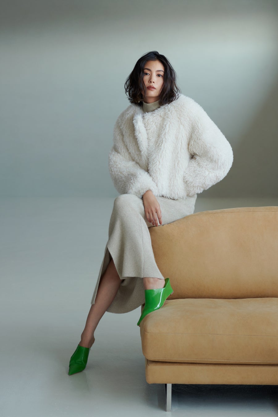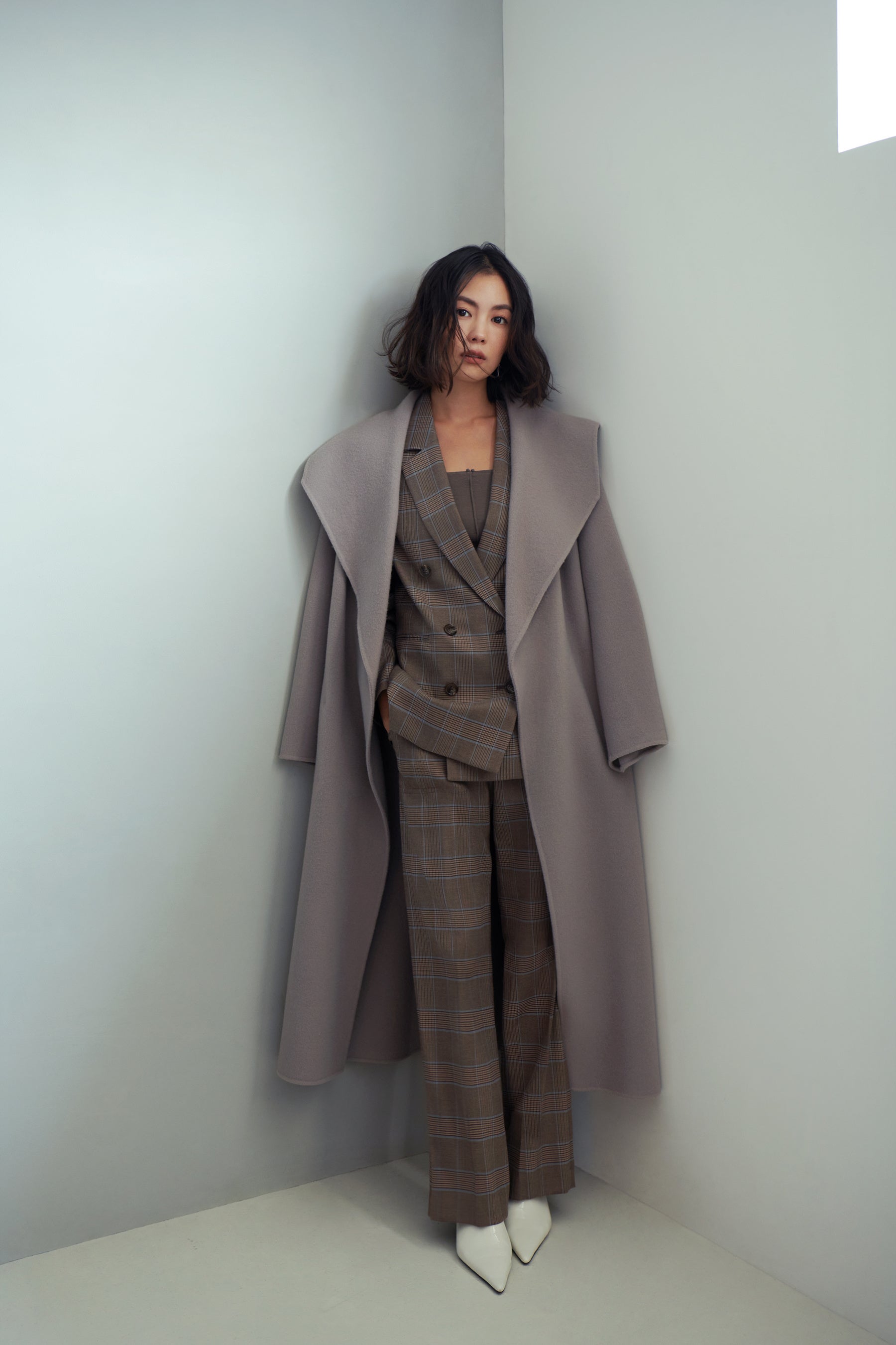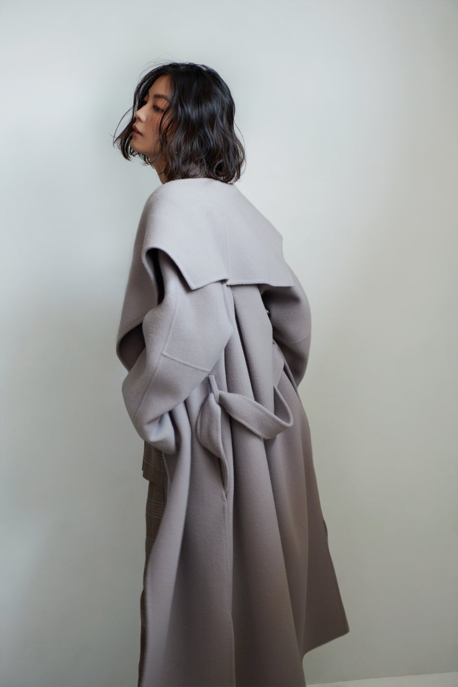 エコファーやパワーショルダー、ペプラムシルエットなどを取り入れたアウター全12型をモデル矢野未希子が着用